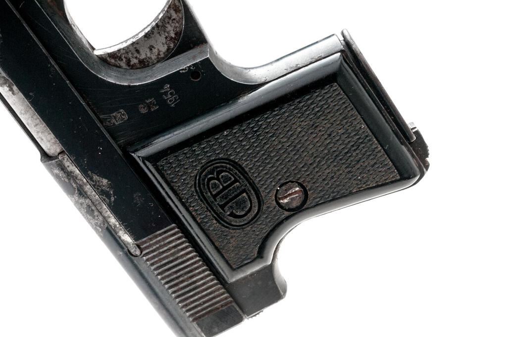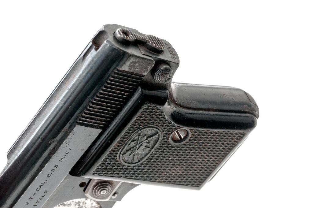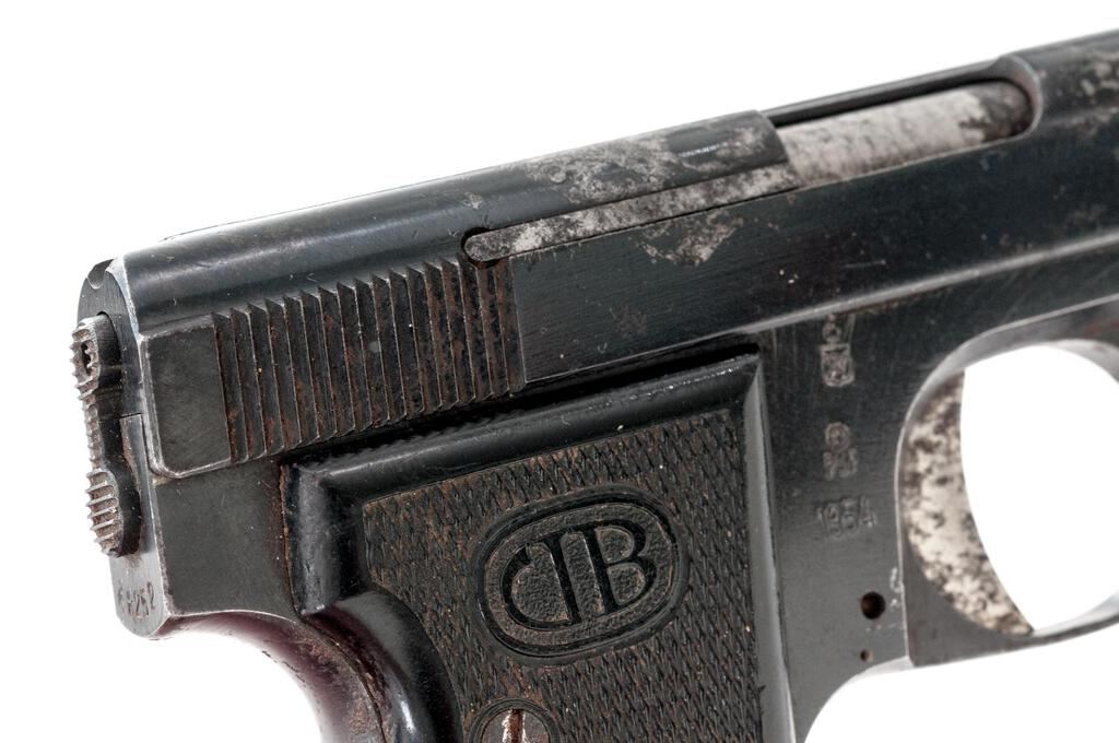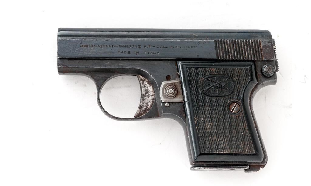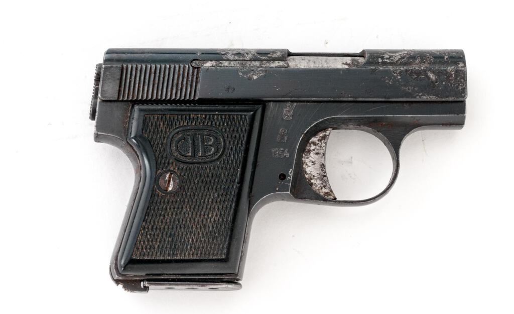 Bernadelli Vest Pocket Pistol, #68252, .25 ACP cal., 2-1/8'' barrel, blue finish, factory black plastic grips, with one magazine. Right side of frame is dated 1954. Condition is fair to good and retains approx. 70% blue. Slide with areas of finish loss that may have been chemically cleaned, with a few areas of spotted surface rust and dark spotting. Grips show moderate wear. Good action and lightly frosted bore. Est.: $150-$250. (C&R/PPT)