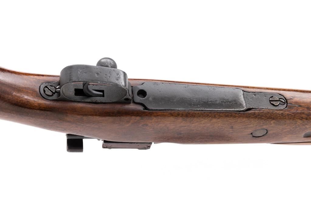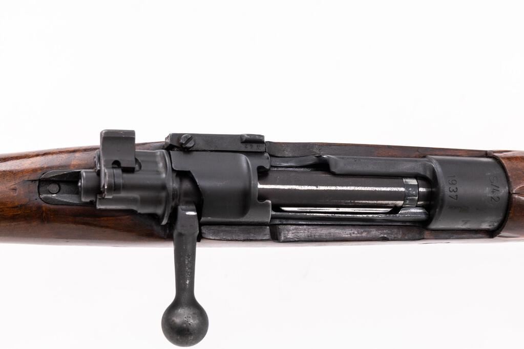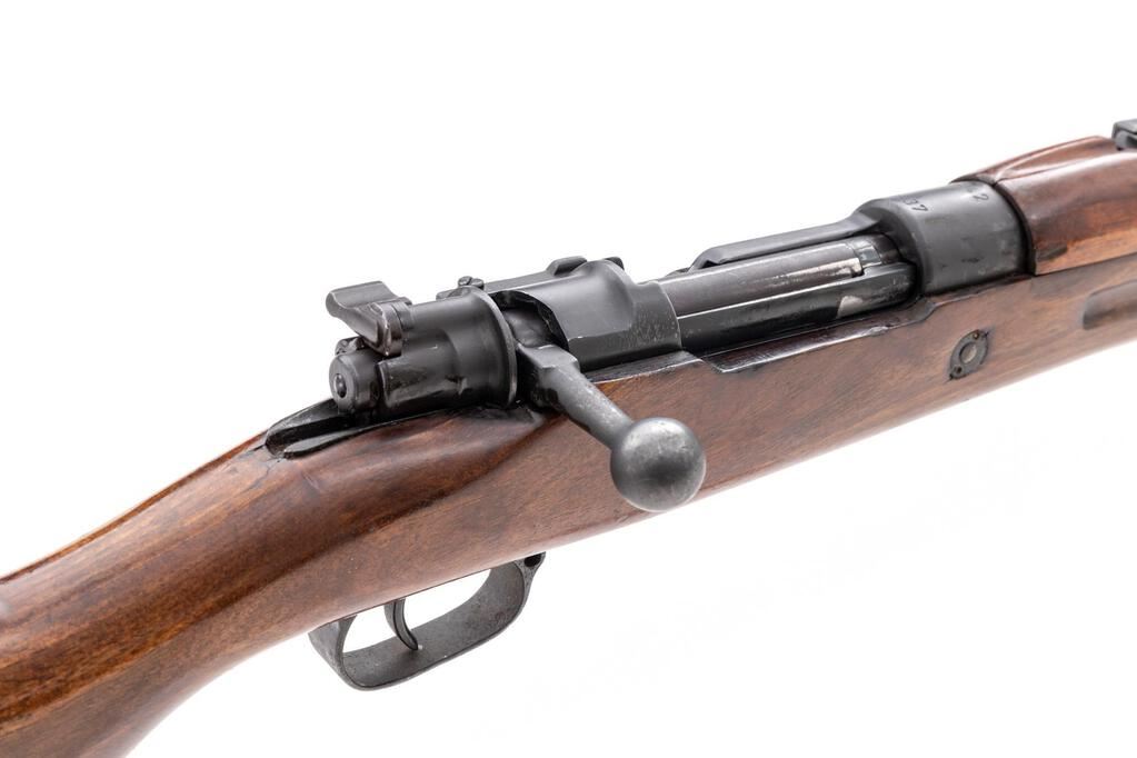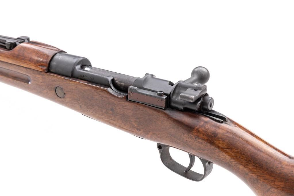 Composite German/Spanish Model 98 Mauser Bolt Action Rifle, #742, 8x57mm, 23.6" barrel, black paint/blued finish, hardwood stock set, inverted "V" front sight with attached hood and adjustable tangent rear sight. No cleaning rod. Rifle is built from a German WWI barreled action and a Spanish stock and hand guard. Receiver ring is marked on top "S/42/1937", and the left-side receiver rail is marked "Mod.98". Rear sight leaf is marked "S/42G". Mismatched numbers on replacement bolt assembly. Condition overall is good to very good as modified, with the receiver and barrel retaining most of its applied black-painted finish. Trigger guard shows old damage and a blued finish. The wrist is cracked and chipped behind the receiver tang, and the forend shows cracks forward of the trigger guard; hand guard is cracked behind the rear sight. Action operates smoothly, bright bore is good with worn rifling. No visible import marks. Est.: $600-$800. (C&R)