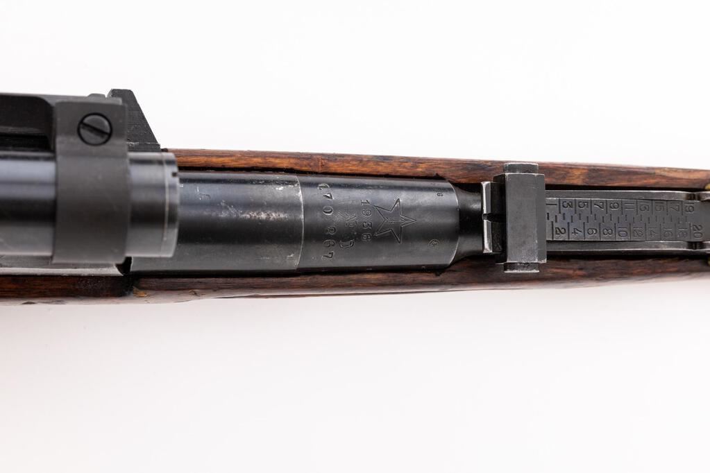 Finnish Property Marked Soviet Model 91/30 Mosin-Nagant Bolt Action Rifle, with PU Telescope, #170867, 7.62x54Rmm, 29" barrel, blued finish, hardwood stock, hooded post front sight and adjustable leaf rear sight. Cleaning rod mounted under the barrel, and a very good condition Soviet cotton sling is attached to the swivels. The bolt handle has been altered to look like a long turned-down sniper type by cutting and rewelding. Marked on top of barrel shank with the fletched arrow inside five-pointed star of the Tula Arsenal over "1936" and a stamped letter "D"; left side with "SA" Finnish property stamp. Right-side buttstock stamped with a circled "CCOP" cartouche forward of a circled "Rb" stamp. Matching numbers on receiver, barrel shank, and bolt; mismatched number on buttplate. Condition overall is very good with the metal retaining over 80% finish. Wear to the buttplate accounts for much of the finish loss. Forend and hand guard show scars and bruises to the right side, and three notches have been carved into the left side of the wrist, otherwise, the wood is good showing chips, handling marks, and scratches to the dark finish. Action operates smoothly, dark bore has light frosting and well-defined rifling. Import stamped on underside of barrel. The PU scope is marked "Star/Hammer & Sickle/Half Moon/91 30" and is numbered "No. b-156640", with round top turret screws. Mount is a reproduction.  Condition overall is very good showing light scratches to the underside of the tube. Optics show a dull yellow color with a sharp reticle. Both knobs turn with effort. The mount is unmarked and is in excellent condition. Includes a very good condition leather lens cover and cotton scope cover. Est.: $700-$900. (C&R)