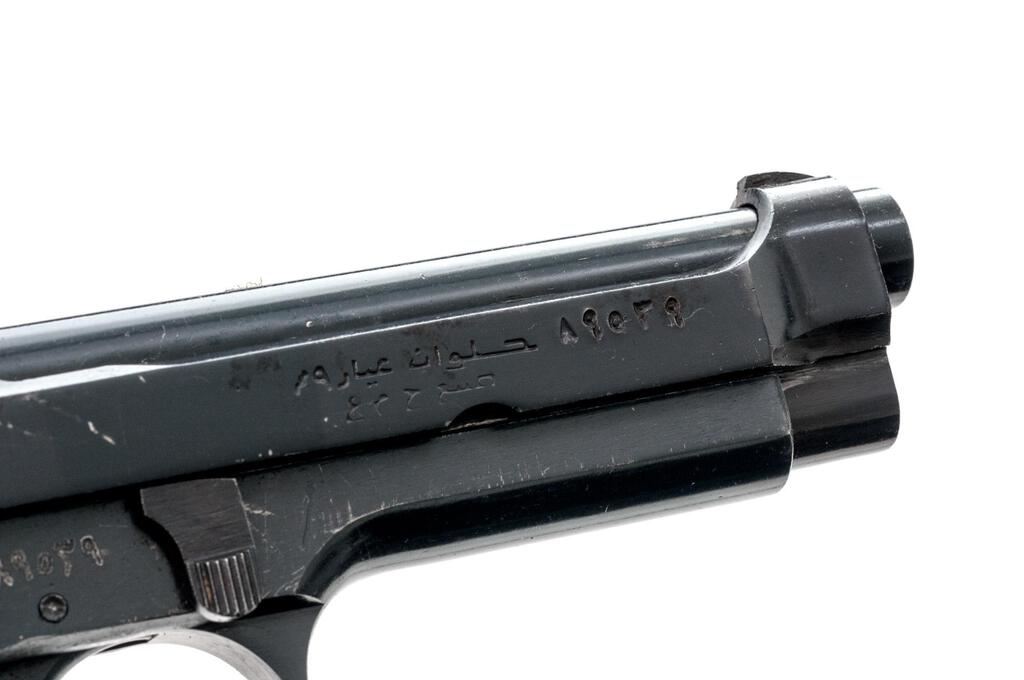 Egyptian Helwan Semi-Automatic Pistol, with 2 Magazines, #4010, 9x19mm, 4.5" barrel, blued finish, black plastic grips with horizontal grooves, blade front sight and drift adjustable rear sight with square notch. Magazine #1 is mfg'r marked on the spine and has a matching Arabic serial number engraved on the floorplate. Good condition with finish wear and frosting. Magazine #2 is mfg'r marked on the spine and has no serial number. Condition is good with patina to the floorplate. Pistol is marked "HELWAN CAL.9 m/m/A.R.E." on left-side slide and marked with Arabic script on right-side slide. Matching Arabic serial numbers on right-side frame and slide. Condition overall is very good with the metal retaining approx. 85% finish, with overall light scratches and handling marks. Grip panels have a gap in the rear where they don't fit together. Condition is very good showing mostly light handling marks and scratches. There is patina to the bolt face. Action operates smoothly, bright bore is very good with very good rifling. Import marked on left side of frame. Est.: $400-$600. (C&R/PPT)