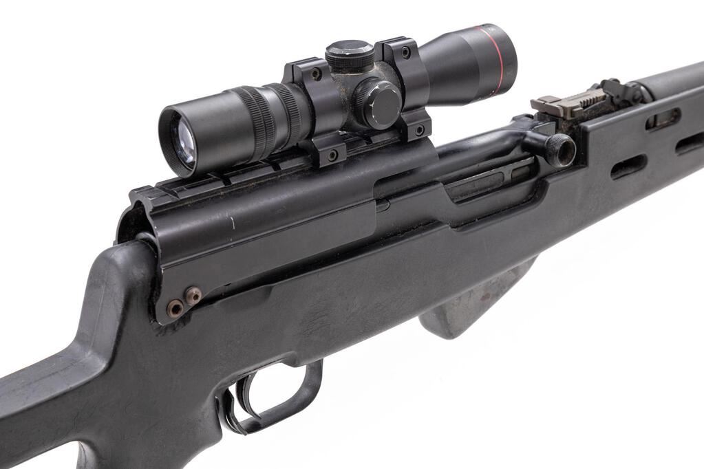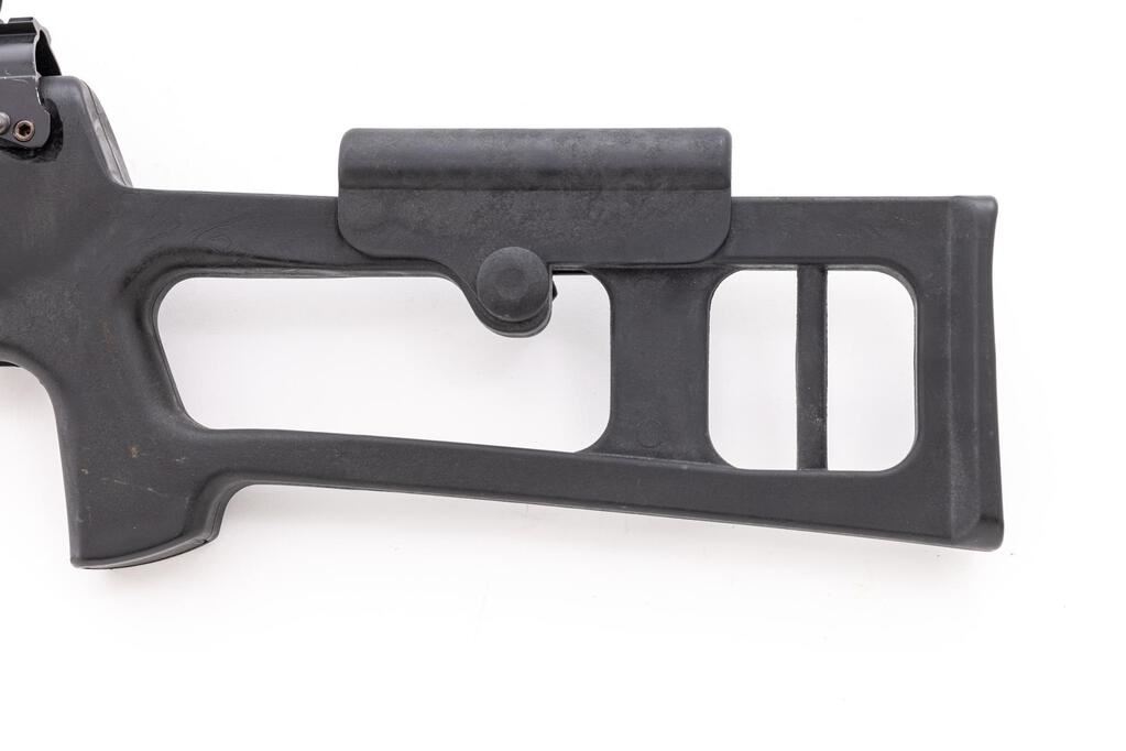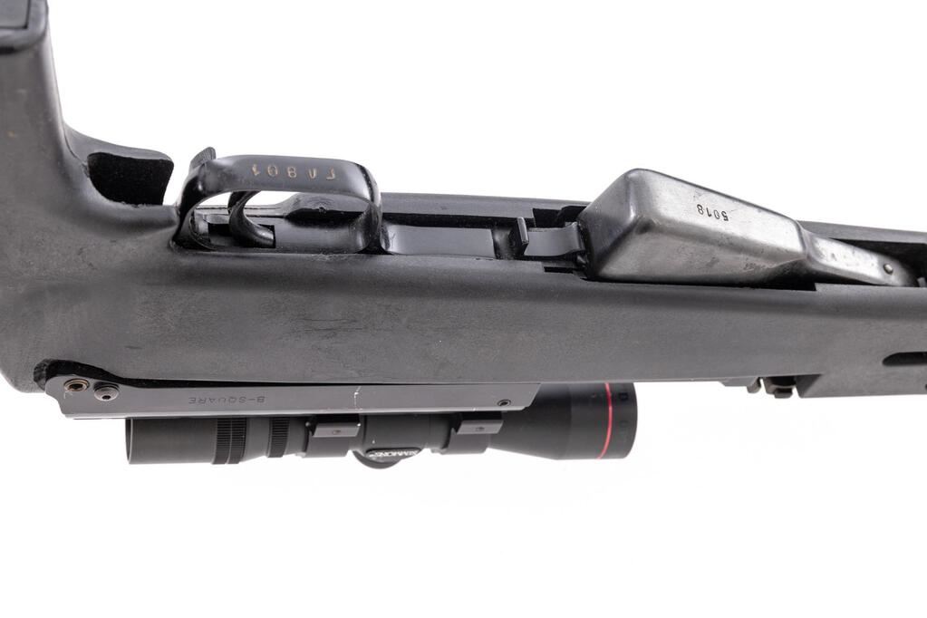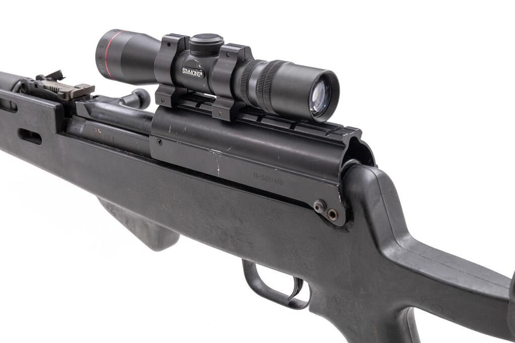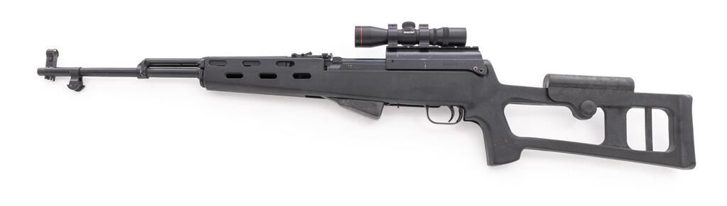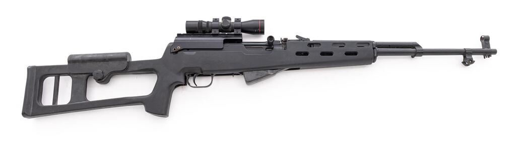 Soviet SKS Semi-Automatic Carbine, #GL801, 7.62x39mm, 20.75" barrel, blackened finish, black plastic Fiber Force SKS stock, hooded post front sight and adjustable tangent rear sight. B-Square top cover with Simmons 4x28 scope. Matching original numbers on visible parts. No bayonet or cleaning rod. Condition overall is good with the metal blued finish beginning to fade in areas. Receiver has been drilled on both sides to secure the B-Square top cover. Action and magazine operate smoothly, bore is bright with light pitting throughout. Scope optics are clear with duplex reticle. Import engraved on right side of barrel. Est.: $500-$800. (Modern/PPT)