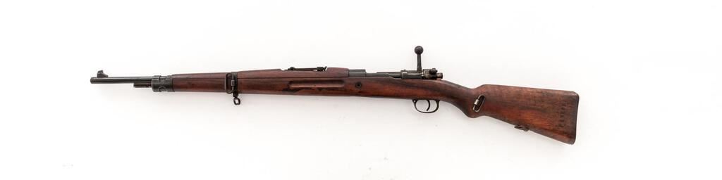 Czech VZ-24 Mauser Bolt Action Rifle, #P47808, 8x57mm, 23.6" barrel, blued finish, hardwood stock set, inverted "V" front sight and adjustable tangent rear sight. Missing cleaning rod. Marked on top of receiver ring "1937", and "CESKOSLOVENSKA ZBROJOVKA, A.S, BRNO" on left side receiver rail. Matching numbers on bolt handle and stock. Condition overall is good. Most of the metal is covered by some amount of patina and overall darkening. Forend has a closed crack under the bolt handle, otherwise the wood is good, showing some dark areas and light handling marks. Action operates smoothly, bright bore is excellent with sharp rifling. No visible import marks. Est.: $400-$600. (C&R)