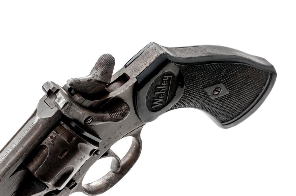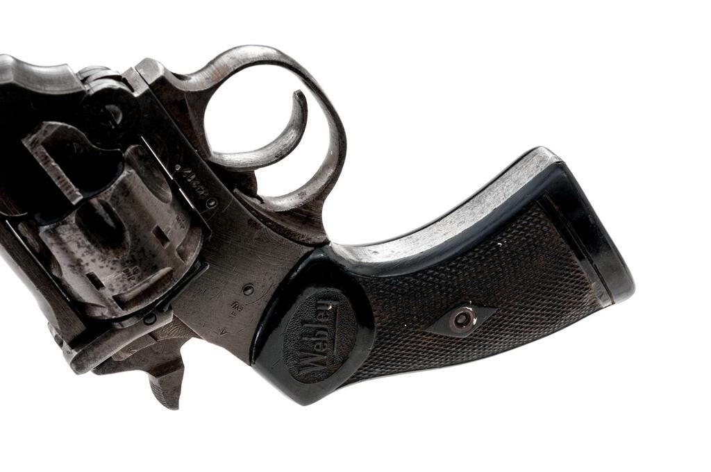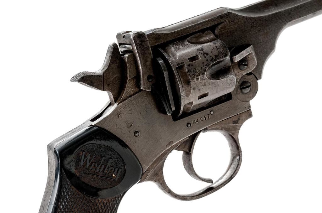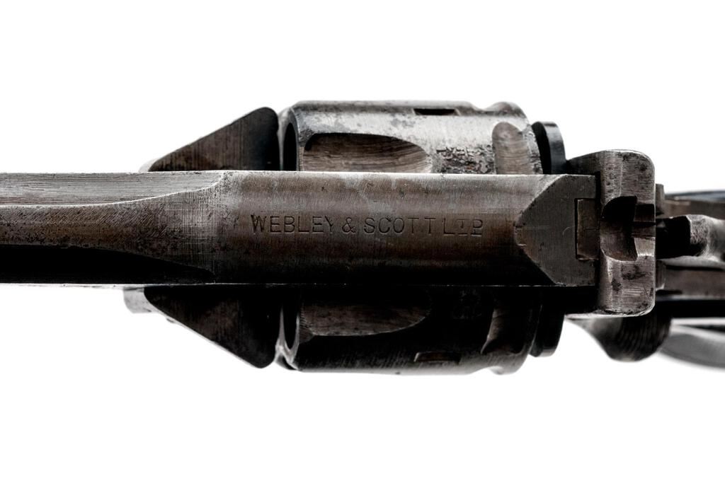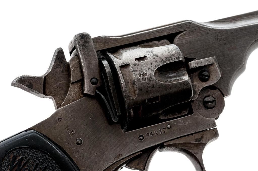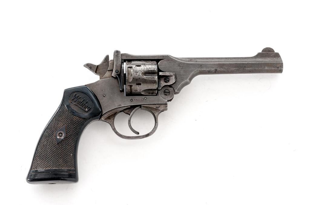 British Webley Mk IV Double Action Revolver, with Holster, #84217, .38 S&W cal., 5" barrel, blued finish, black plastic checkered grips with Webley logo on each side, blade front sight and fixed square-notched rear sight. Lanyard loop assembly has been removed from butt of grip. Marked "WEBLEY & SCOTT LTD" on top of barrel strap and "MARK IV .38" on left side; frame marked "WAR FINISH" and stamped with a "Broad Arrow" British Gov't ownership mark along with proof and view stamps. Matching numbers on barrel and cylinder. Condition overall is good. Most of the finish has been worn from the metal, which is now a dull color showing overall dark spots and patina. Grips are good with overall handling marks, chips, and flattening to the checkering. Action locks up, cycles, and extracts smoothly; bore has scattered small spots of patina, otherwise good, with very good rifling; chambers are clean and bright. Birmingham export proof marks stamped on left side of frame and barrel. The Australian made holster is ink stamped "H&Co.1944/D(Broad Arrow)D" under the flap and "(Broad Arrow)H" on the rear, with added penned writing on the forward edge. Holster condition is close to excellent showing bright colors with all stitching and metal intact. Est.: $500-$700. (C&R/PPT)