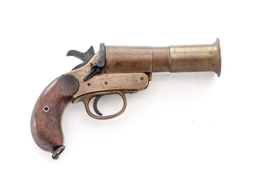 British Webley Mark III* Single Shot Flare Pistol, #76294, 1" bore cal., 5.6" barrel with bell, brass frame and barrel, smooth hardwood grips, no sights. Lanyard ring attached to bottom of grip. Marked on right-side frame with the Webley trademark "Winged Bullet/W&S" logo; left-side frame marked "WEBLEY & SCOTT LTD/LONDON & BIRMINGHAM" and "III*". Proof, inspection, and "?17" in-service marks stamped into left-side frame and barrel. Matching numbers on underside of barrel and extractor. Condition overall is very good, with the brass frame and barrel showing a few handling marks and a darkened patina. Steel hammer, trigger, and barrel stirrup have an overall patina. Grips have a few dark spots and show mostly light handling marks. Action operates smoothly; bore has some dark areas that may clean better, otherwise good. Est.: $250-$400. (Non-gun)