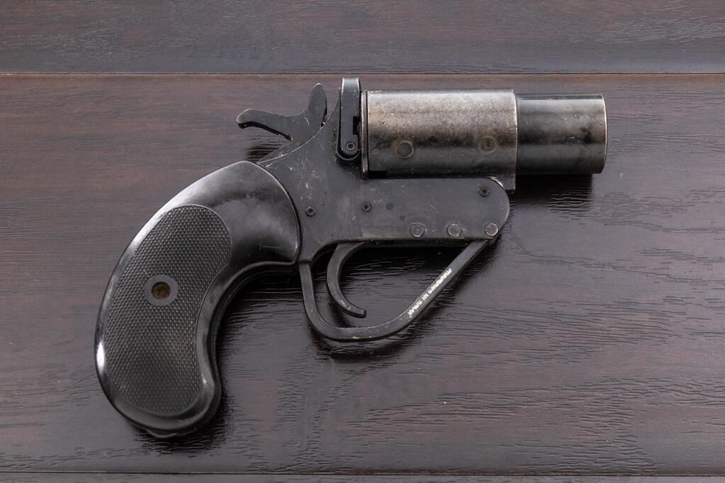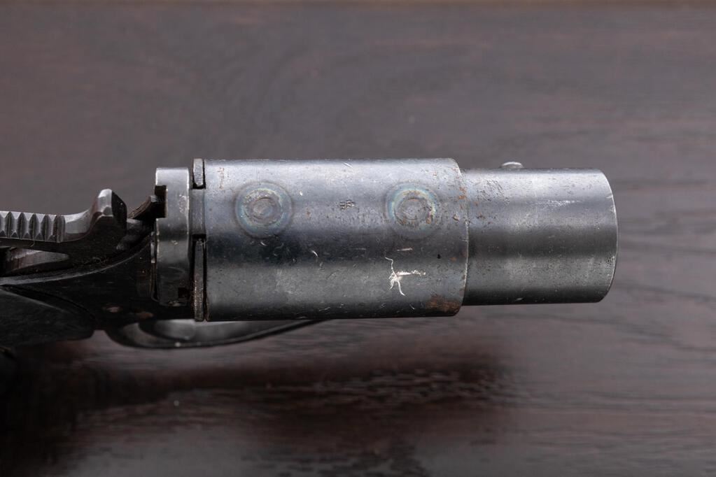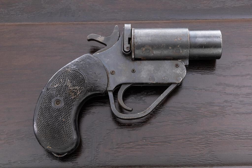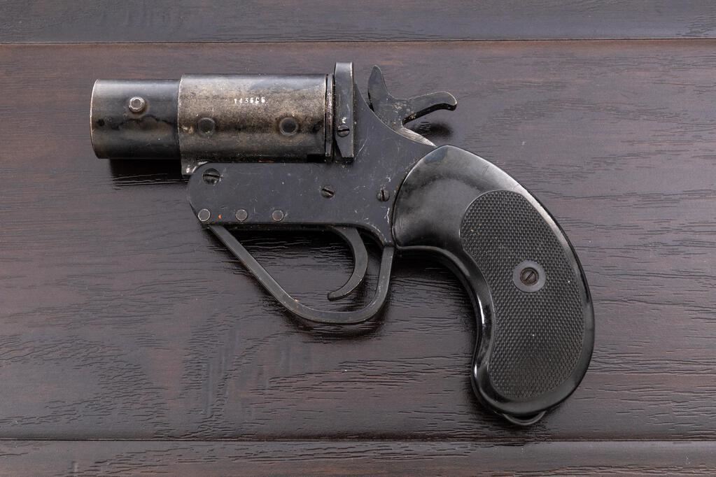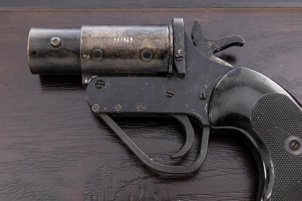 Group of Three (3) WWII British No. 2 Mk 5 Flare Pistols, 26.5mm bores, takes 1" flare cartridges, 3.6" barrels, all three have the round lug on the barrel associated with RAF issued pieces, external hammers marked M601 (war-time mfgr's code), top "U"-shaped opening lever, retracting lanyard loops, and black composite checkered grips. 1.) Number 108421, small proof on top of barrel, broad arrow on frame, NP proof on side of barrel, trigger guard stamped "Made in England", bore is clean, numerous scratches and small dings, some old dried grease in recesses. 2.) Number 075292, small proof on top of barrel, broad arrow on frame, bore is mint, numerous small scratches and minor dings, couple of tiny rust spots. 3.) Number 143606, small proof on top of barrel, broad arrow on frame, partial black painted finish over bluing, trigger guard stamped "Made in England", bore is lightly rusted overall but should clean well, with numerous small scratches and light wear. Est.: $400-$600/Lot. (Non-gun)