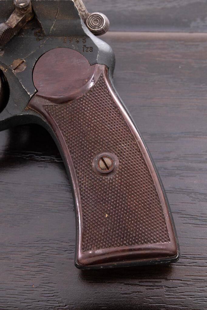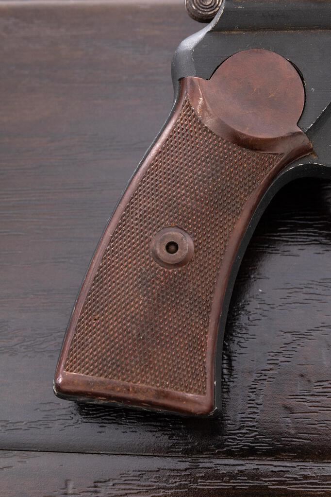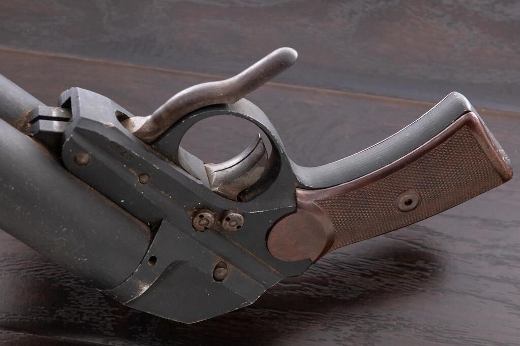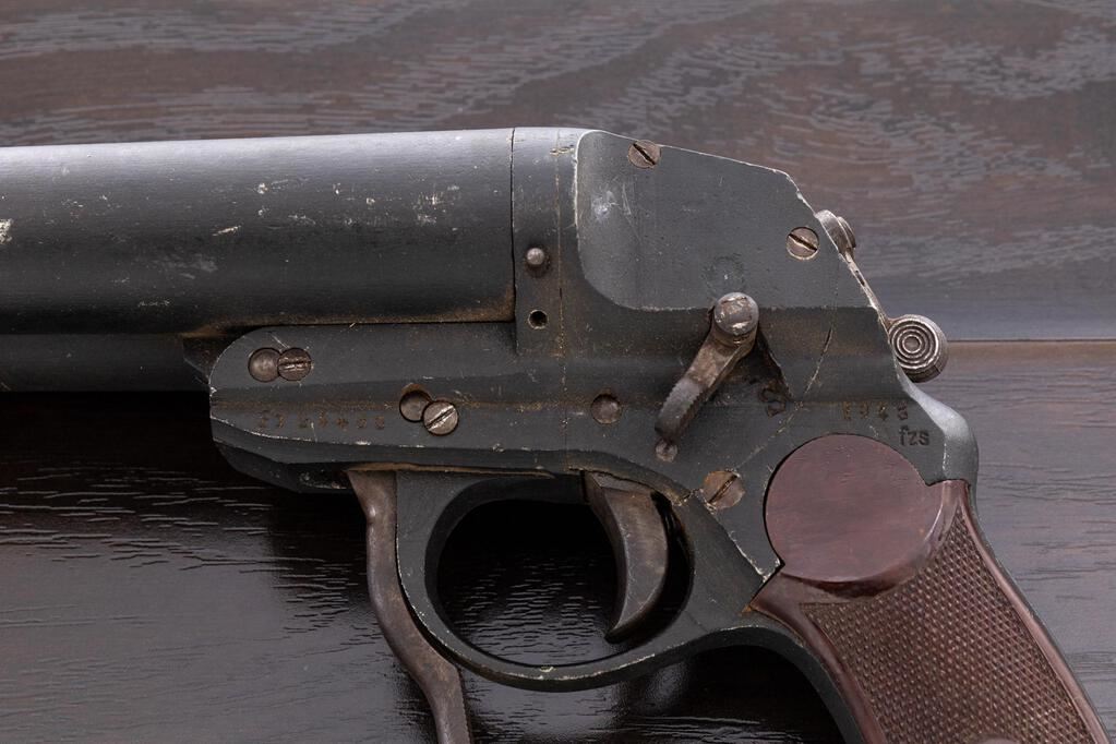 WWII German Luftwaffe Double Barrel Aluminum Flare Pistol, #F1 24483, 26.5mm (4 bore) cal., 6.5" barrels, black dull finish, underlever cocking mechanism, side safety lever, cocking indicators, lever for firing right or left barrels, maker marked "fzs" for Krieghoff Firearms Co., dated 1943, brown Bakelite checkered grips, Luftwaffe eagle acceptance stamps and "4" in a circle marks on top of barrels. Condition is very good retaining most of its black anodized finish, with minor scratches and light dings, oxidation to the various screws, levers, and small parts. Cocking action is a little sluggish and may need lubrication; bores show light pitting marks near the middle and front. Grips show a few scratches and dings, mainly on the bottom edges. Est.: $600-$900. (Non-gun)