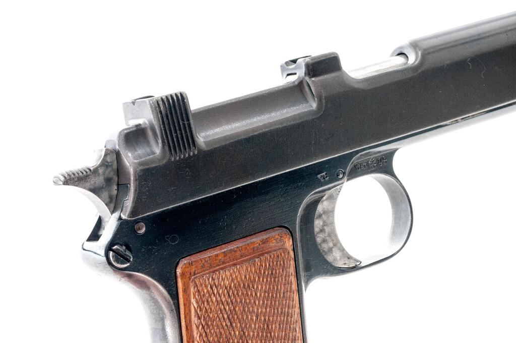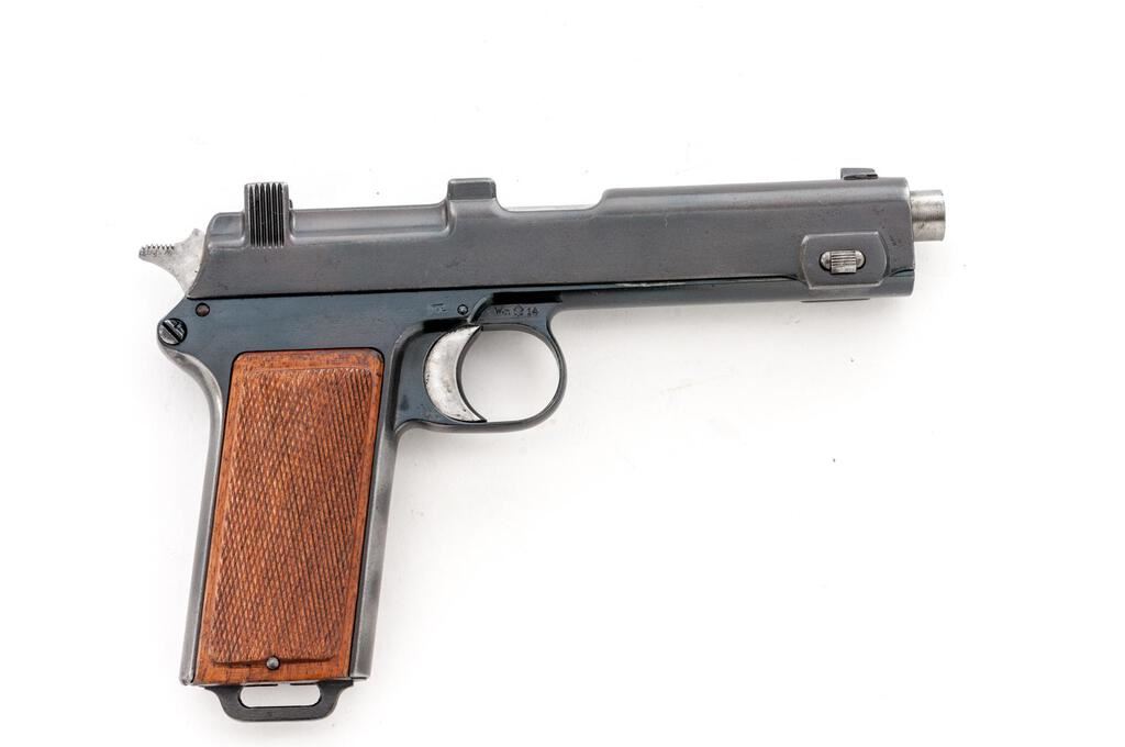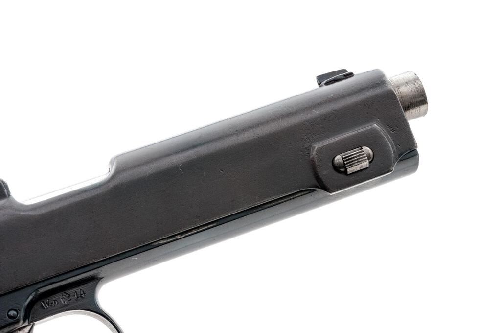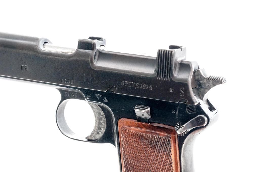 Nazi Police Marked Steyr-Hahn Semi-Automatic Pistol, #604g, 9mm Luger cal., 5-3/16" barrel, blued finish, polished barrel, engine-turned finish on trigger, top spring, and hammer; internal magazine, drift adjustable blade front sight and fixed integral rear sight with "V" notch, slide marked "08" denoting conversion to 9mm Luger cal., original Austrian eagle proof and "Wn.14" marking at trigger guard, small parts and slide marked with a "k", Nazi "(eagle)N" firing proof on left side of frame, Nazi Police "(eagle)L" proof mark on right side of frame, "SW 362" stamped into lanyard loop at bottom of grip, and checkered wood grip panels. Condition is very good as refinished/re-blued, the frame and slide showing some polishing that did not remove all the previous pitting and scratches. Slide has a duller gray blue finish than the frame, with no appreciable wear to the slide. Frame shows thinning to gray on the front and rear grip straps and bottom of trigger guard. Barrel is polished in the white. Trigger, hammer, and top spring are polished with an engine-turned machined bright finish. Action, hold open, and safety function properly; bore is mostly bright with a light frosting that may improve with a good cleaning. Grips are very nice with crisp checkering and a light varnished finish. Est.: $500-$700. (C&R/PPT)