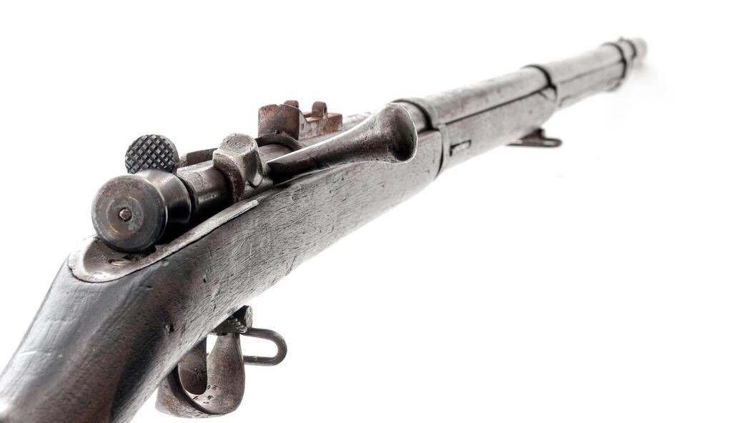 Scarce Antique Carcano Model 1868 Needle Fire Rifle, #953, converted from percussion, 17.5mm, 37.25" rifled barrel, straight grip nearly full-length wood stock with steel buttplate. Small blade front sight, rear sight base only. Sling swivel mounted to the middle band and front of trigger guard. Right side is dated, what looks like "1864". Large upside down "26" is stamped on right side of the buttstock with smaller horizontal "3728". There is an illegible proof mark on the old percussion base, small numbers stamped on inside of the trigger guard. After the noticeable battlefield success of the Dreyse needle fire rifle. The Italians began these conversions in 1867, using Salvatore Carcano's system. Condition is good with scattered areas of rust patina and moderate pitting to the metal. Heavier rust is present on the rear sight base. Wood with dark staining throughout, scattered dents and scratches. There is a crack to the right side of the forend that runs the full length, between the front and mid-barrel band. Action is stiff and functions but not smoothly. Needle sticks approx. 1/8" past the bolt face. Rifling is visible but the bore is dark with heavy frosting and some visible erosion. Hard to find in any condition. Est.: $700-$900. (Antique)