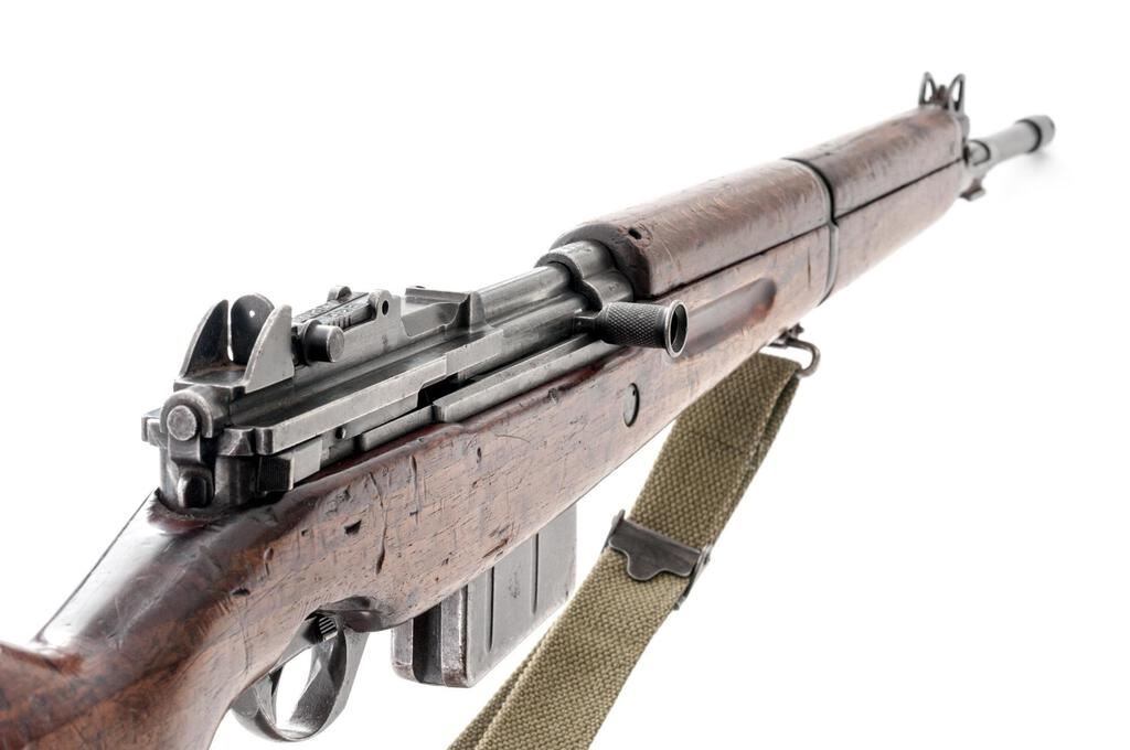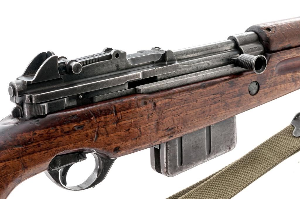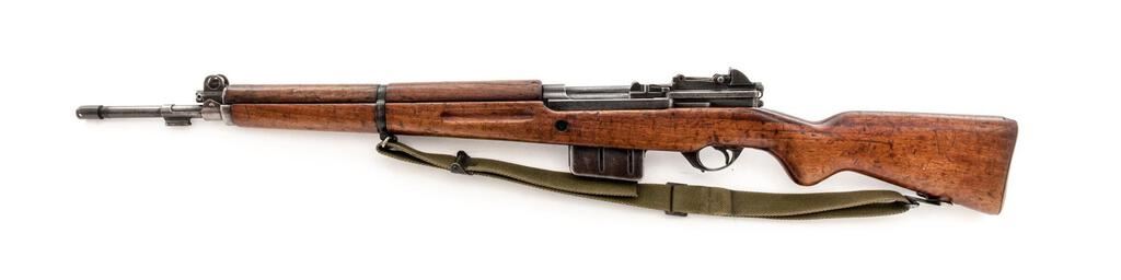 Egyptian FN-49 Semi-Automatic Rifle, #19649, 8x57mm, 23.2" barrel, blued finish, hardwood stock set, blade front sight with protectors and adjustable leaf rear sight with aperture. Steel replacement marking disc is mounted to right-side buttstock, and a good condition green nylon sling is attached to the underside. Marked on top of receiver ring with Royal Egyptian crown, and on the left-side receiver rail "FABRIQUE NATIONALE D'ARMES DE GUERRE_HERSTAL BELGIQUE". Matching Arabic numbers on receiver cover. Condition overall is good with the metal retaining approx. 40% finish, now showing darkening with areas of old patina. Wood is good with overall dents, scratches, and handling marks to the finish. Action operates smoothly; bore has slight darkening in the grooves, otherwise very good with very good rifling. Import stamped on underside of barrel. Est.: $700-$900. (C&R/PPT)