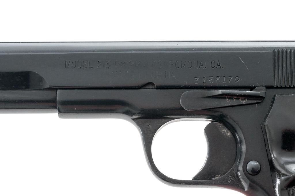 Norinco Model 213 Semi-Automatic Pistol, #3156172, 9x19mm, 4.5" barrel, blade front and "U"-notched fixed rear sights, satin blue finish, checkered plastic two-piece grips with a lanyard ring, and one 8-shot magazine. Mfg'd 1956. Pistol is very good overall condition retaining approx. 90% blue finish, with light pitting and surface erosion on the underside of the barrel lug, scratches around the safety, and light wear on the front strap. Grips are in good condition and fit well. Action functions well, bore is good with defined rifling. Import marked "KSI POMONA, CA." on left side of slide, as well as "MADE IN CHINA". A Chinese made copy of the Russian Tokarev TT-33, these pistols were imported in 1988 only. Est.: $300-$500. (C&R/PPT)