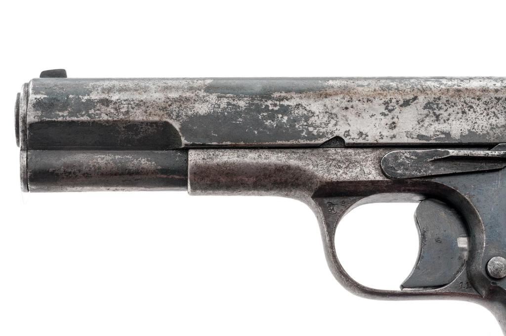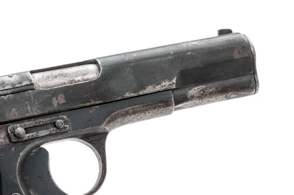 Soviet TT-33 Semi Automatic Pistol, with Accessories, #29768, 7.62x25mm, 4.6" barrel, blued finish, black plastic grips with vertical checkering and five-pointed star in center, blade front sight and fixed "U"-notched rear sight. Marked on left-side frame and top of slide with matching numbers and "(star)1937". Pistol has lanyard loop installed on left side of grip frame. No safety lever. Condition overall is fair with the metal retaining approx. 30% finish, showing thinning, patina, and darkening. Grips appear to be later replacements and are in very good condition with scattered handling marks to the checkering. Action operates smoothly, bore has darkening in the grooves with good rifling. No visible import marks. Magazine #1 has a lanyard loop on the base and is in very good condition showing light wear. Magazine #2 has a lanyard loop on the base and is in fair condition with overall wear and patina. Holster is unmarked and has a repaired loop on the rear. Holster condition is good showing overall wear and handling marks. No cleaning rod is present. Est.: $400-$600. (C&R/PPT)