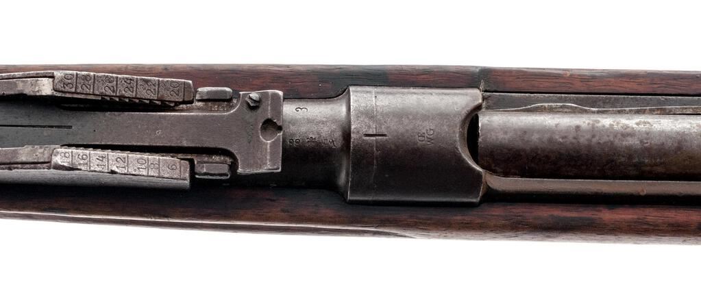 Austro-Hungarian Steyr Model 1888/90 Mannlicher Straight-Pull Rifle, #6879R, 8x50Rmm, 29.75" barrel, blued finish, hardwood stock, inverted "V" front sight and adjustable leaf rear sight. Marked on top of receiver ring "OE/WG". Barrel shank marked "Wh(Eagle)88". Rear sight has arsenal add-on plate calibrated to 3000 schritt (paces). Bolt head is missing and rifle will not fire. Stacking hook is also missing. Mismatched number on left side of buttstock. Condition overall is fair with most of the metal toned to a brown patina. Wood has a few gouges to the underside, otherwise good with overall darkening. Action operates stiffly; bright bolt assembly has rust across the surface; dark bore is poor with barely visible rifling. Est.: $400-$600. (Antique)