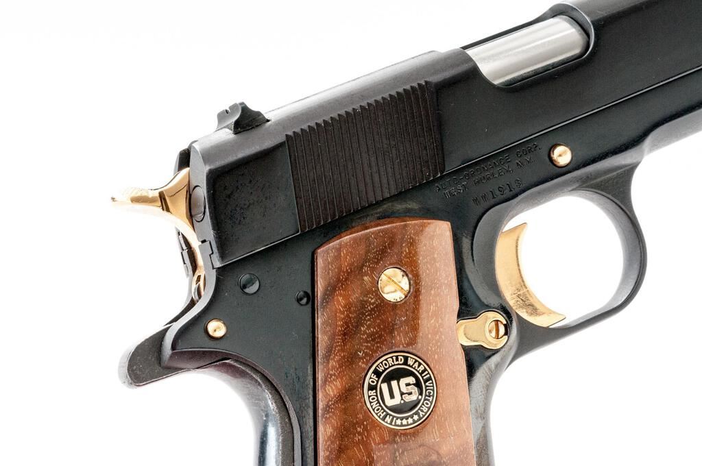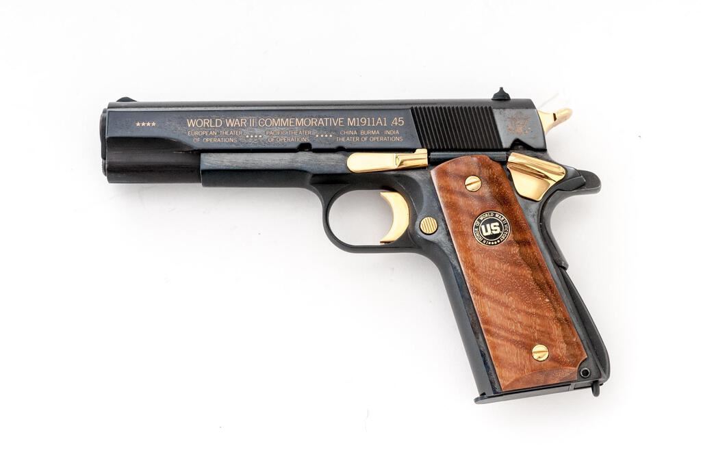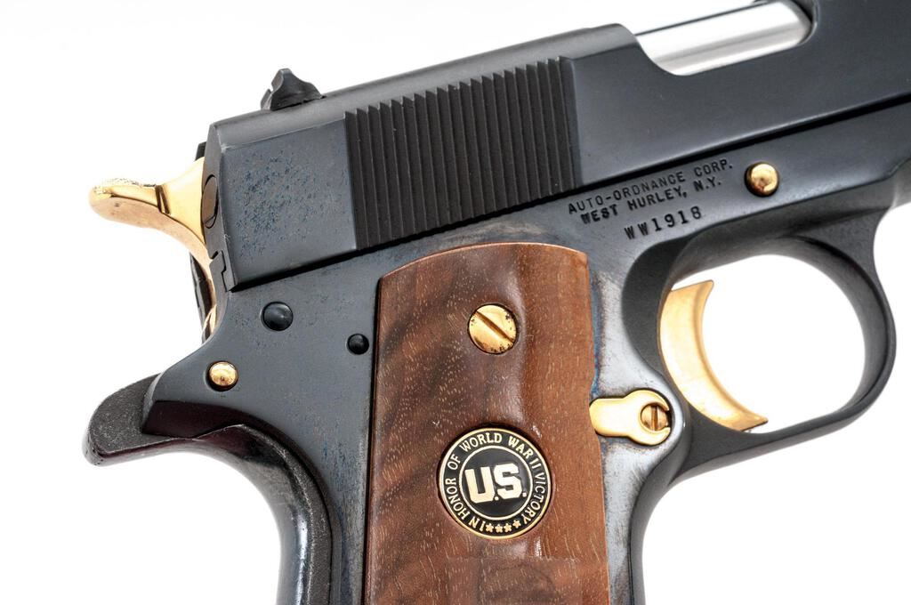 Auto-Ordnance M1911A1 WWII Commemorative Semi-Automatic Pistol, #WW1918, .45 ACP cal., 5" barrel, blade front and fixed rear sights, blue with gold script finish, smooth wood two-piece medallion grips, gold trim on slide stop, manual safety, trigger, hammer and magazine ejector button, lanyard ring, and 7-rd. unmarked magazine. Pistol is in fine overall condition with light scratches, mars, and handling marks. Slide lists in inlaid gold script the WWII Theaters of Operation, with a sharp Ordnance eagle at rear of slide. Smooth wood medallion grips are very good. Action is crisp, bore is good. Est.: $600-$800. (Modern) (Not available to Calif. residents.)