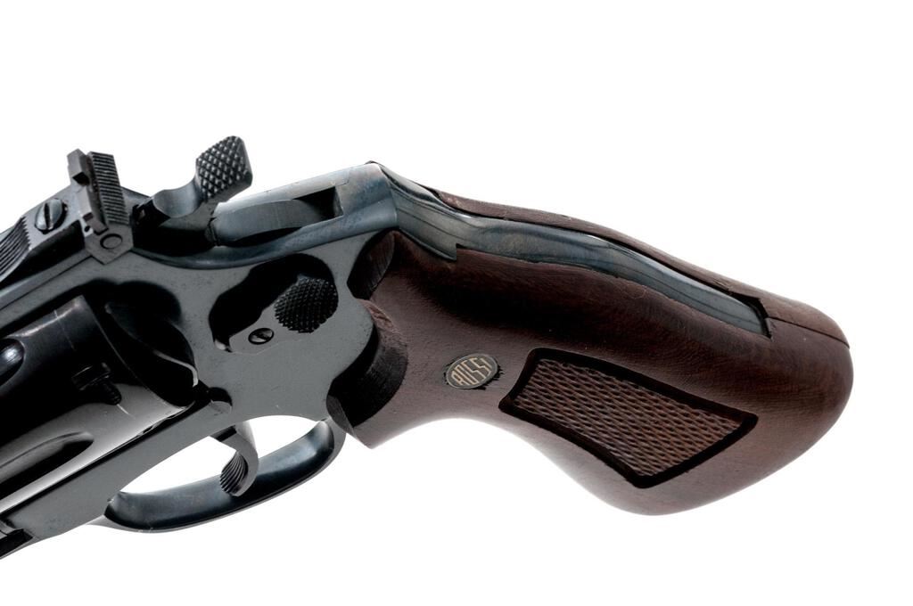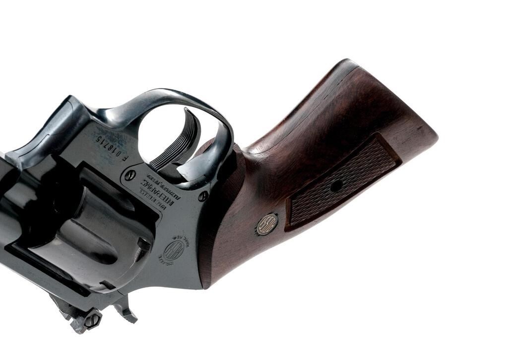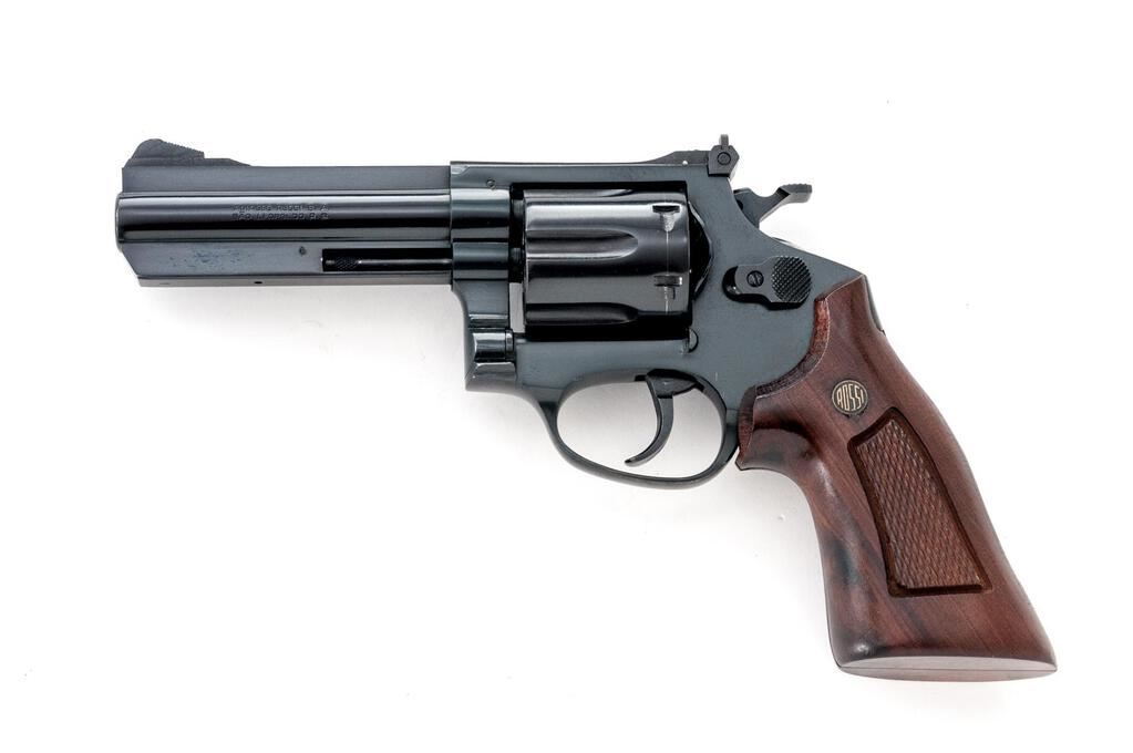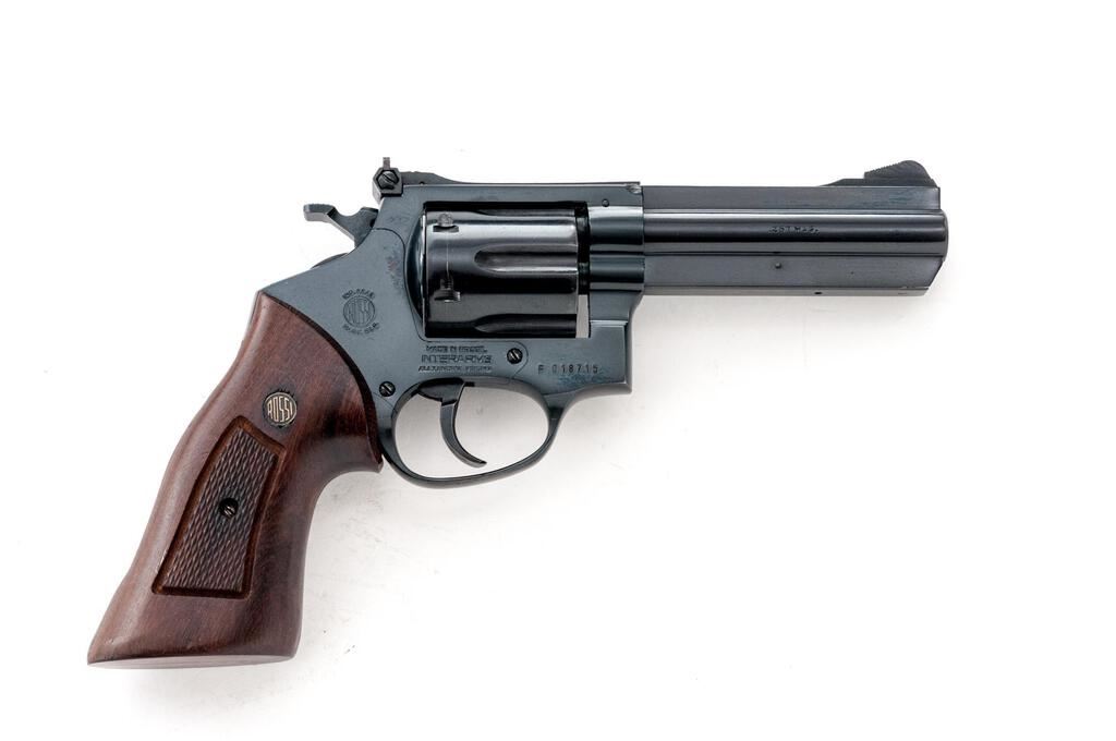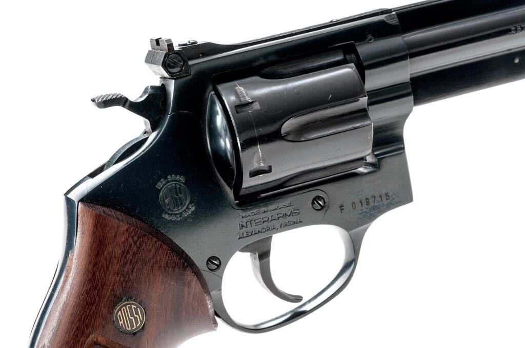 Rossi Double Action Revolver, #F018715, .357 Magnum cal., 4" barrel with a solid rib, serrated blade front and adjustable rear sights, 6-shot cylinder, blue finish, checkered hardwood two-piece medallion grips. Right side of the frame is import marked by Interarms and shows "MADE IN BRAZIL". Imported from 1988-1998. Revolver is in near excellent overall condition showing little, if any use, retaining approx. 99% factory blue finish with only light handling marks and a faint index line on the cylinder. Grips are excellent with sharp checkering. Bore is excellent and the lockup is tight. This gun appears to be unfired. Est.: $300-$500. (Modern/PPT)