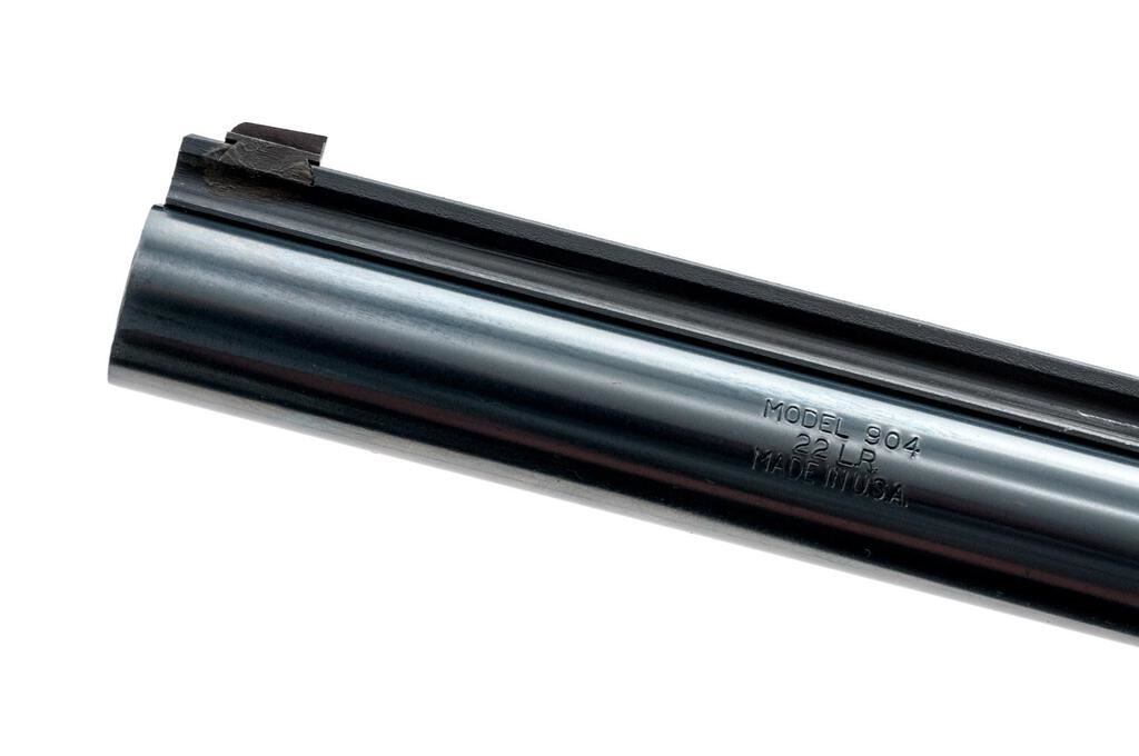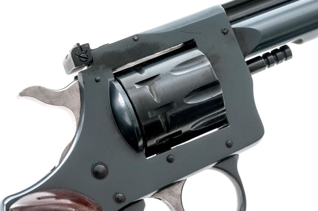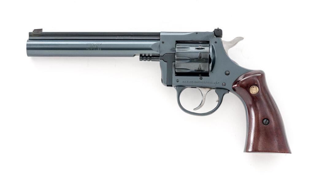 Harrington & Richardson Model 904 Double Action 9-Shot Revolver, #AZ006057, .22 LR cal., 6" barrel with a full-length rib, blade front and adjustable rear sights, blue finish, smooth wood two-piece H&R medallion grips, engine-turned trigger and hammer. Mfg'd 1980-1985. Revolver is in excellent overall condition showing little use, retaining approx. 98%-99% factory finish with light handling marks. Grips are near excellent with small mars. Action is crisp, bore is very good. Est.: $250-$400. (Modern/PPT)