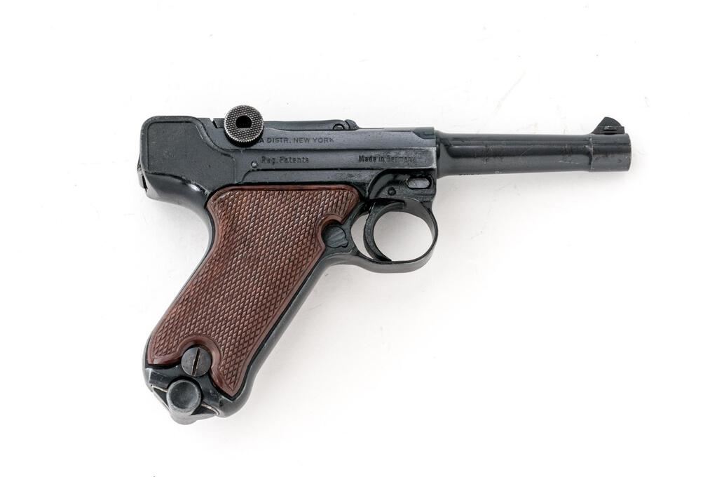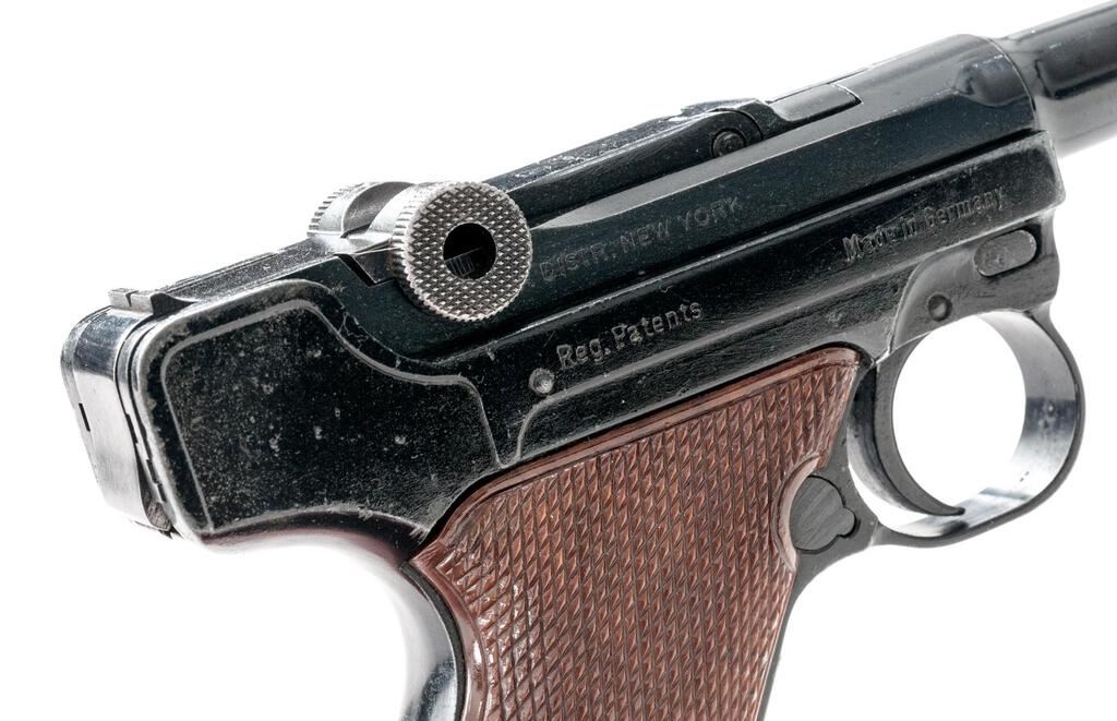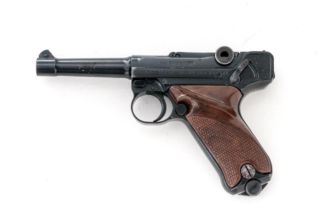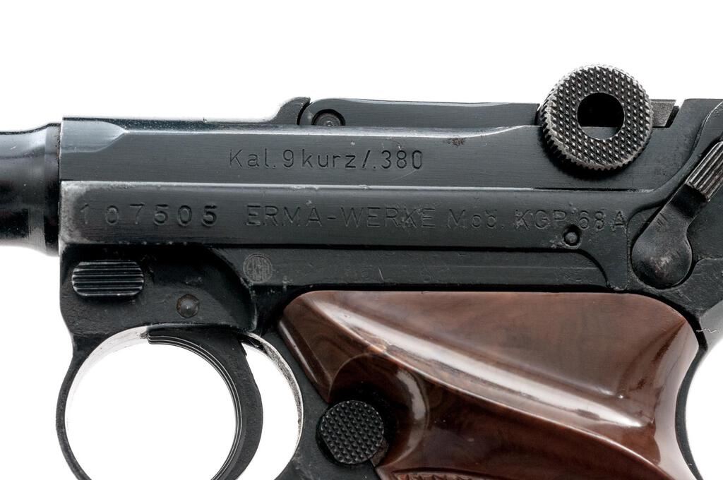 Erma-Werke KGP 68A Semi-Automatic Pistol, #107505, .380 ACP cal., 3.5" barrel, serrated blade front and "V"-notched fixed rear sights, Luger type toggle action, blue finish, checkered plastic two-piece thumb rest grips, and one unmarked magazine. Pistol is in very good overall condition retaining approx. 85%-90% thinning factory finish. There is highpoint edgewear along the frame with thinning of finish and light surface erosion on the barrel. Front and rear grip straps have light scratches and mars. Left side of barrel is marked "Kal 9 Kurz/.380"; left side of frame is marked "Erma-Werke Mod. KGP 68A". There is an Erma emblem atop the toggle (see photo). Right side of barrel is import marked "LA DISTR. New York"; right side of frame is marked "Made in Germany". Grips are good and fit well. Action functions well, bore is good. Est.: $400-$600. (Modern/PPT)
