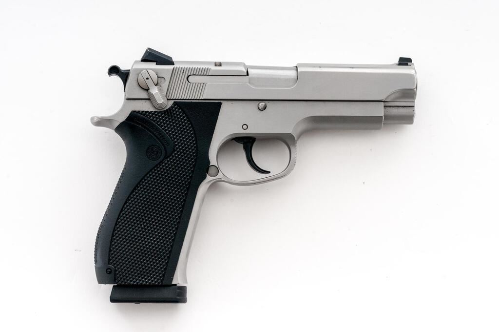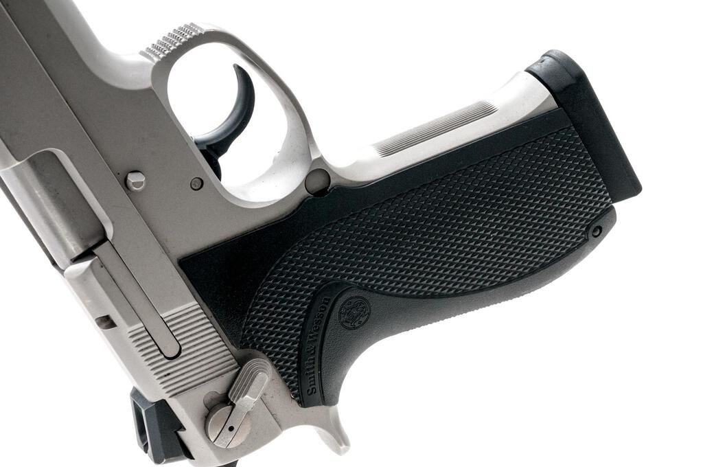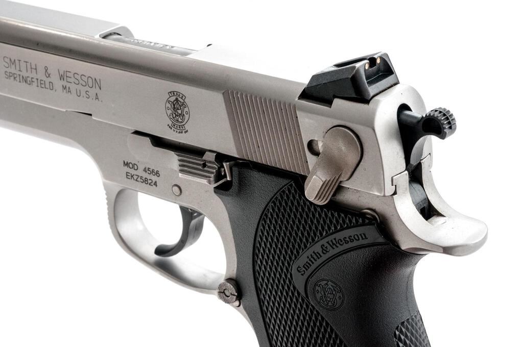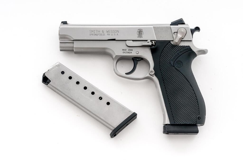 Smith & Wesson Model 4566 DA/SA Semi-Automatic Pistol, #EKZ 5824, .45 ACP cal., 4.25" barrel with three-dot sighting system, stainless steel, checkered rubber S&W marked grips, ambidextrous safety, and two (2) 8-shot magazines, one marked Pro-Mag and the other S&W. Pistol is in near excellent overall condition with light scratches and handling marks, showing little use. Checkered rubber S&W grips are very good. Action is crisp, bore is very good with well-defined rifling. Est.: $500-$700. (Modern/PPT)