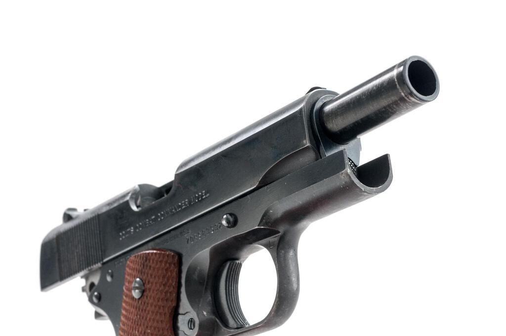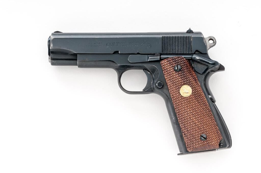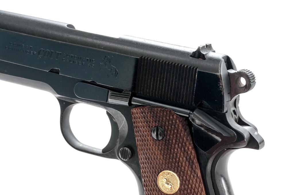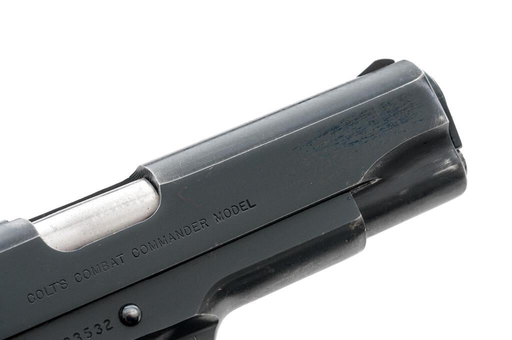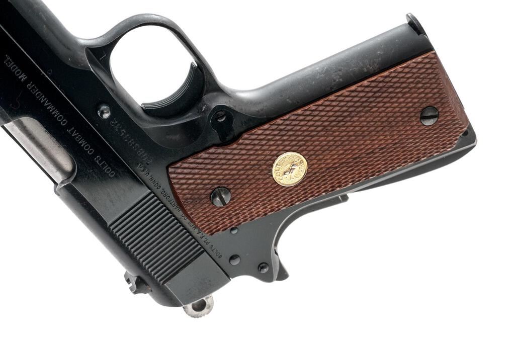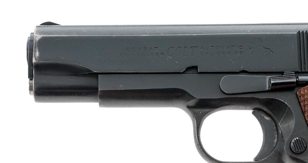 Colt Series 70 Combat Commander Semi-Automatic Pistol, #70BS83532, .45 ACP cal., 4-1/4" barrel, blue finish, checkered walnut grips with gold Colt medallions, standard blade front and square-notched rear sights. Includes one blued steel Colt magazine. Mfg'd 1979. Condition is good retaining approx. 92% blue. Polished slide shows general light handling marks and mild scratches, with a few intermittent specks/spots of mild pitting. There are also a few very small spots of mild pitting on the front strap and front edge of frame. Grips are near excellent showing very few handling marks. Action is tight and operates smoothly. Near excellent bore, bright with well-defined rifling. Est.: $800-$1,100. (Modern/PPT)