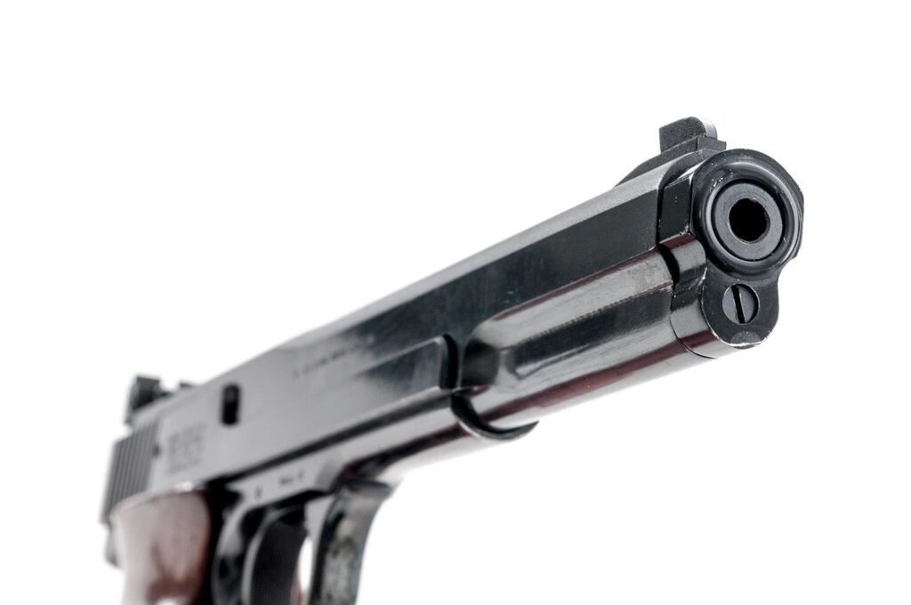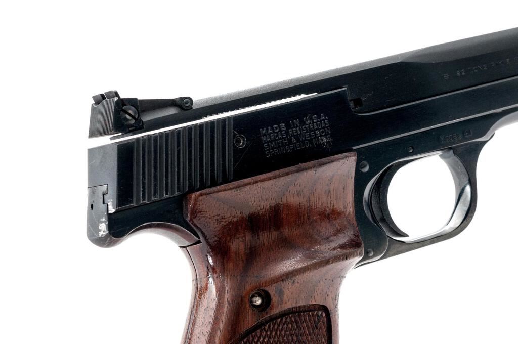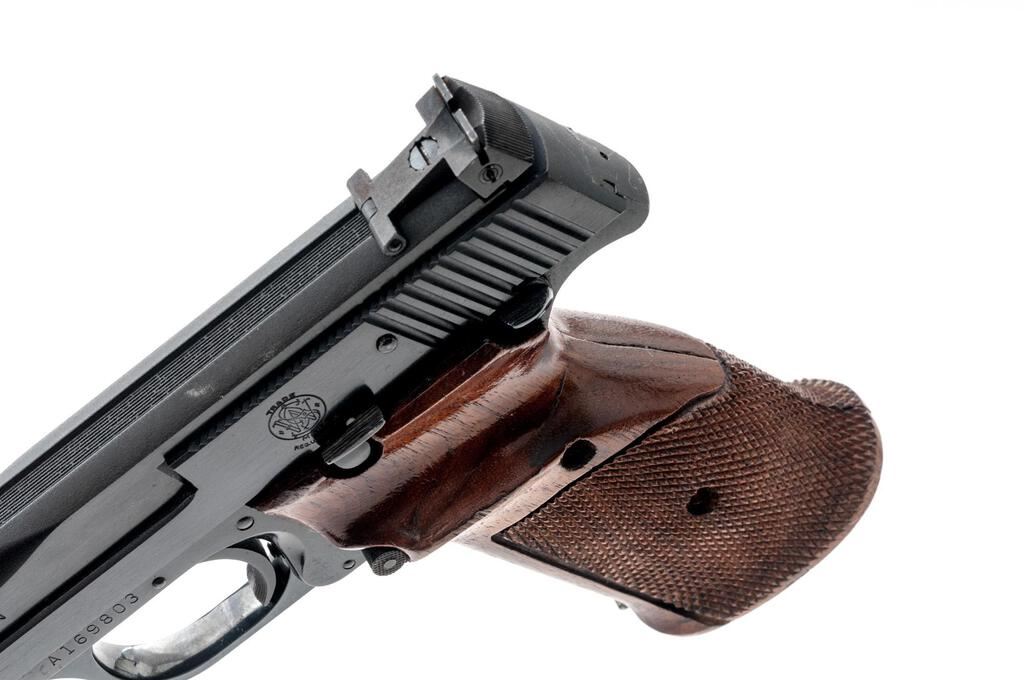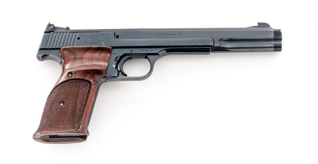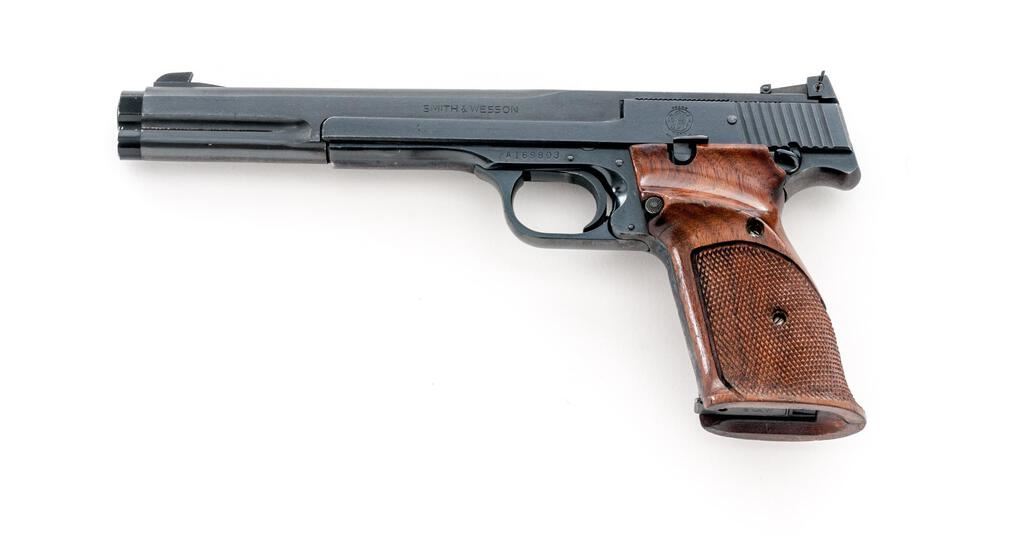 Smith & Wesson Model 41 (No Dash) Semi-Automatic Match Target Pistol, #A169803, .22 LR cal., 7.38" barrel, Patridge front and adjustable rear sights, early cocking indicator, blue finish, checkered wood two-piece thumb-rest target grips with flared magazine well, 10-rd. S&W marked magazine. Mfg'd 1972. Pistol is in near fine overall condition retaining approx. 90%-92% factory finish, with wear at the muzzle, light scratches and mars consistent with use. Pistol shows edgewear with small rubs on top of the slide, and thinning of finish on the front grip strap and rear of slide. Checkered wood target grips are good with dents, compressions, and wear along the thumb rest. There is a larger scratch at the rear of the left panel. Action is smooth, bore is very good with well-defined rifling. Est.: $800-$1,000. (C&R/PPT)