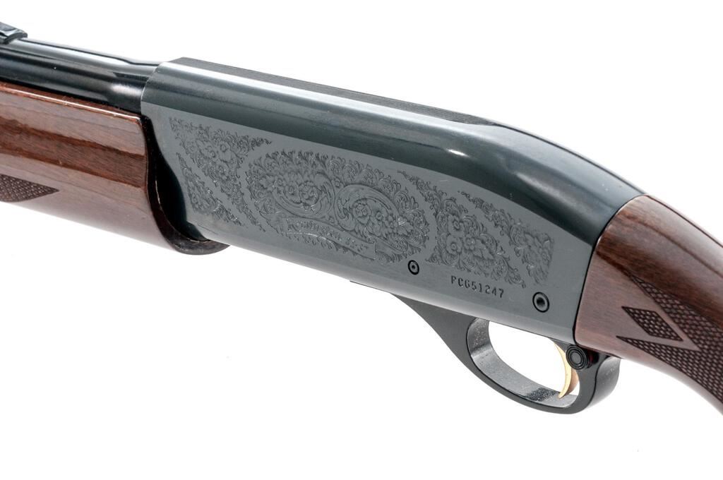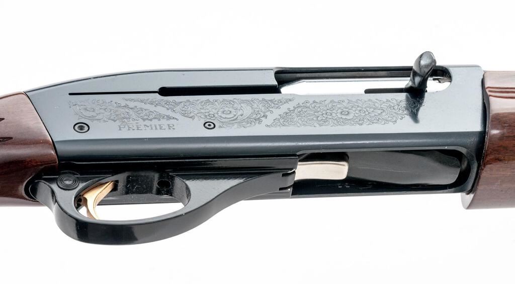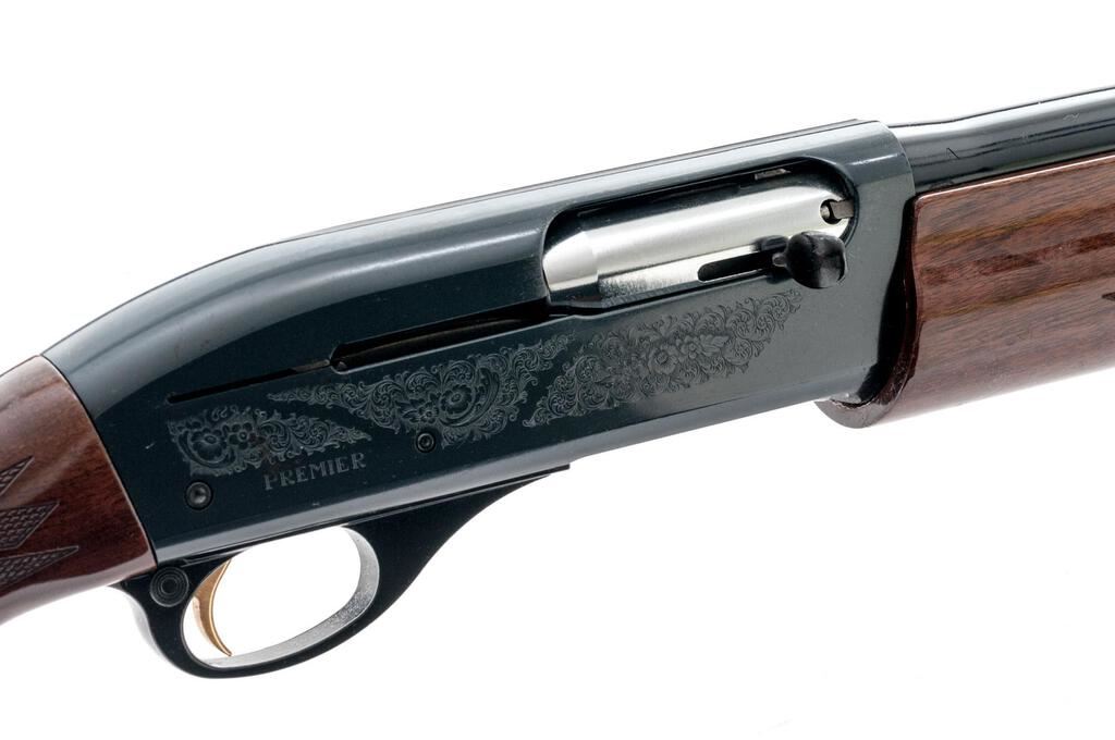 Remington Model 11-87 Premier Deer Gun Semi-Automatic Shotgun, #PC651247. 12 ga. 21" plain barrel has a 3" chamber and is fitted with rifle sights and Rem chokes (rifled tube installed). Action is standard 11-87 but has later engraving pattern on the receiver. The finger-groove forend and pistol grip buttstock are high-gloss walnut and include a special checkering pattern, with Remington grip cap and solid recoil pad. Mfg'd approx. 1990. Condition is near excellent, as carried and shot very little. Action snaps closed tightly and functions correctly; bore is mirror bright. Est.: $400-$550. (Modern)