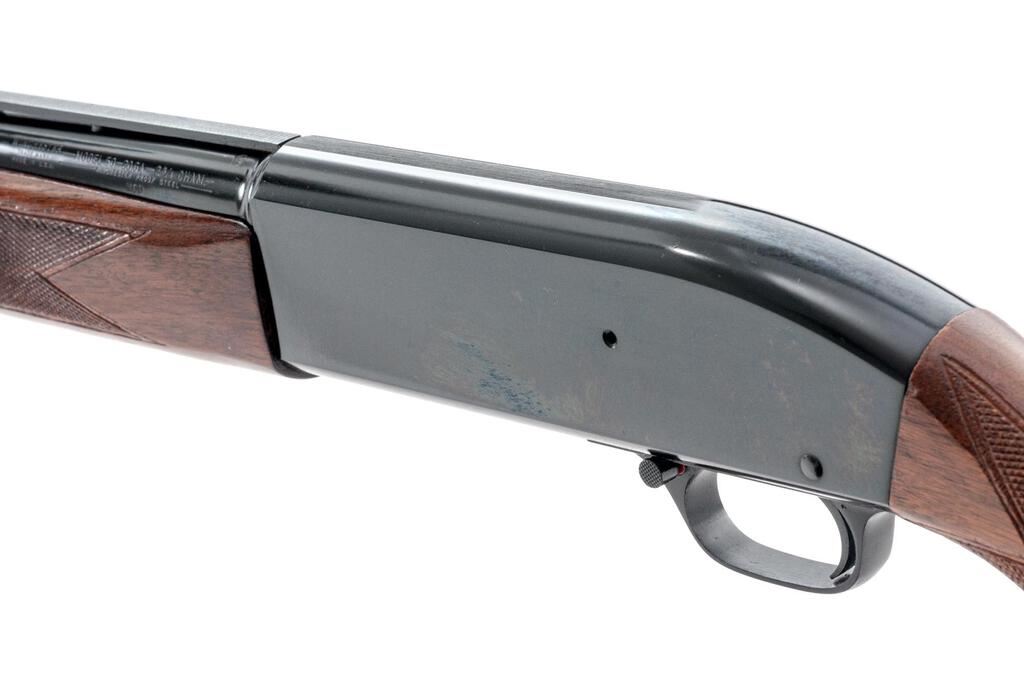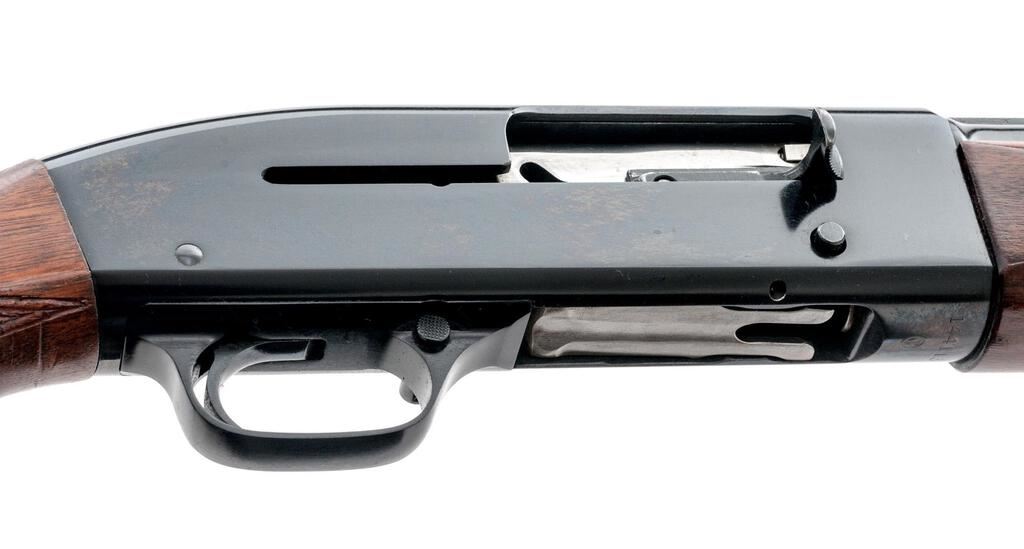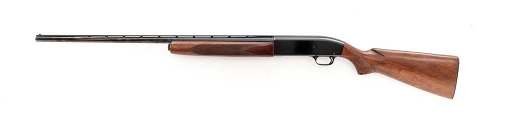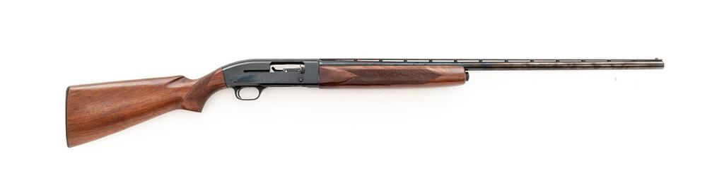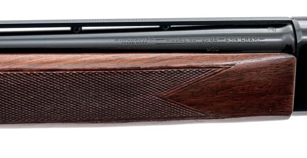 Winchester Model 50 Standard Grade Semi-Automatic Shotgun, #144113. 20 ga. 28" vent rib barrel has target beads, 2-3/4" chamber, and is choked Mod. The recoil-operated action is enclosed in a high-gloss blue steel received. Full forend and pistol grip buttstock are oil-finished walnut with adequate checkering and correct Winchester buttplate. Mfg'd 1959. Condition is very good, with few marks to wood and some dulling to receiver. Action closes tight and functions correctly; bore is bright. Est.: $350-$450. (C&R)