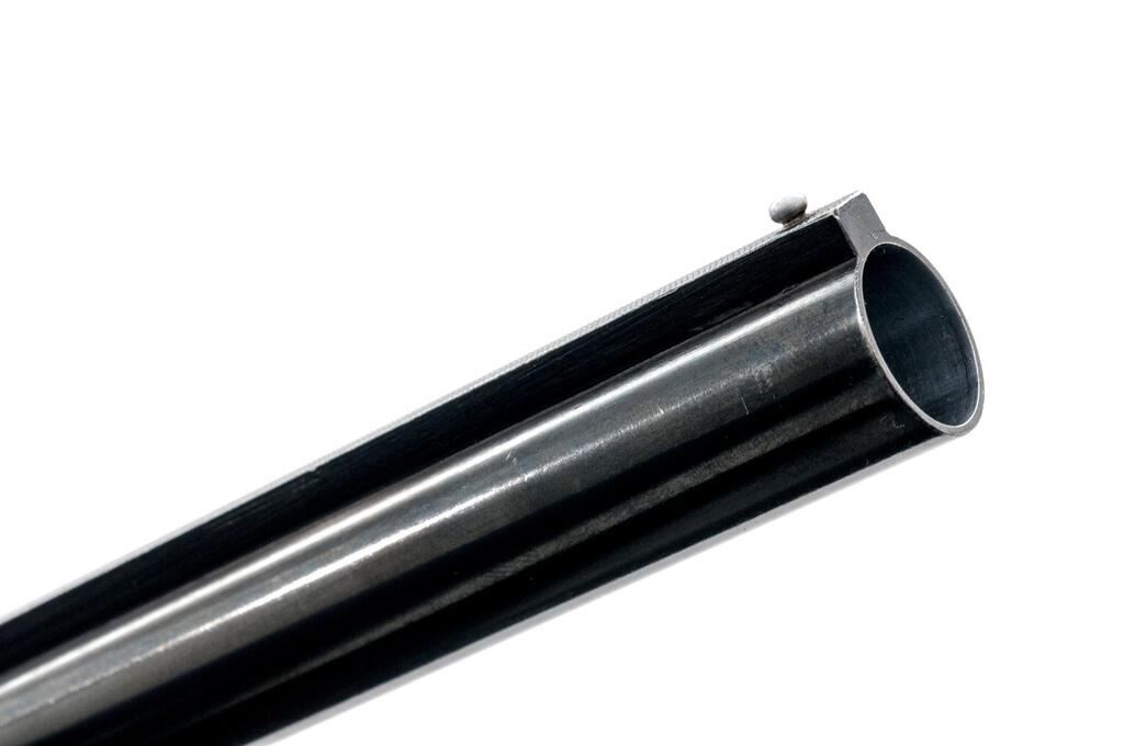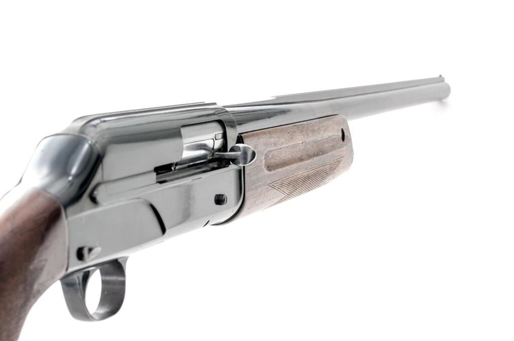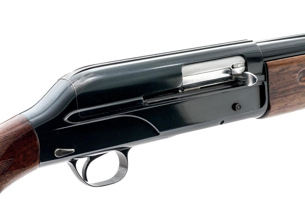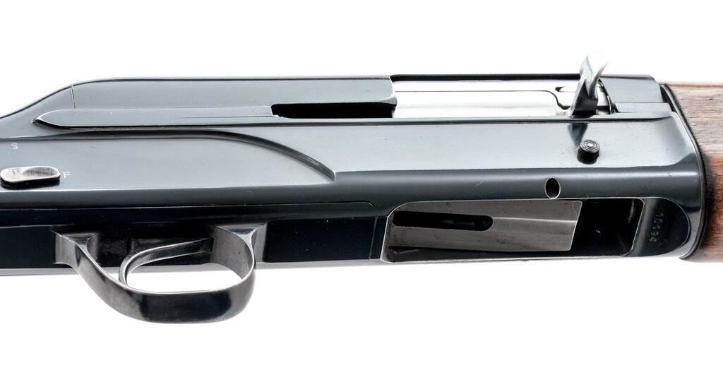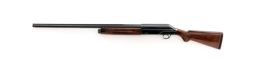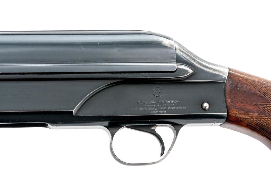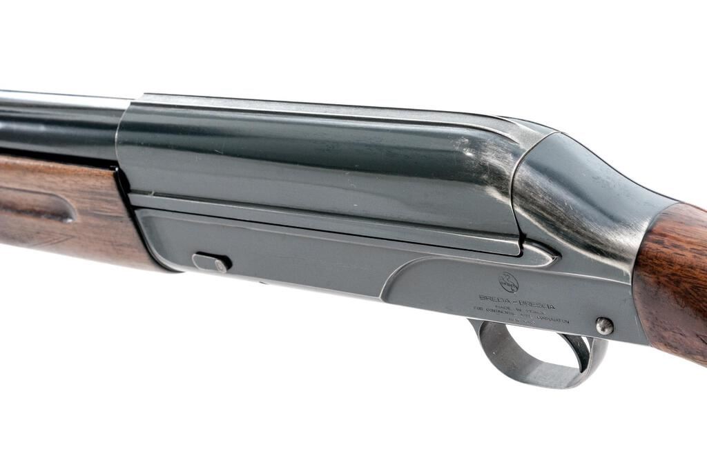 Breda Standard Model Semi-Automatic Shotgun, #10194. 12 ga. 27-1/2" solid rib barrel has a 2-3/4" chamber and is choked Full. The recoil-operated action is similar to the original Browning designs and was popular in Italy after WWII. The finger-groove forend and round knob pistol grip buttstock are European walnut, with worn checkering, Pachmayr pad, and short LOP at 13-1/4". Mfg'd 1952. Condition is good+, with much wear and many mars to wood but expected wear to action, which closes tight and functions correctly; bore is mirror bright. Est.: $250-$350. (C&R)