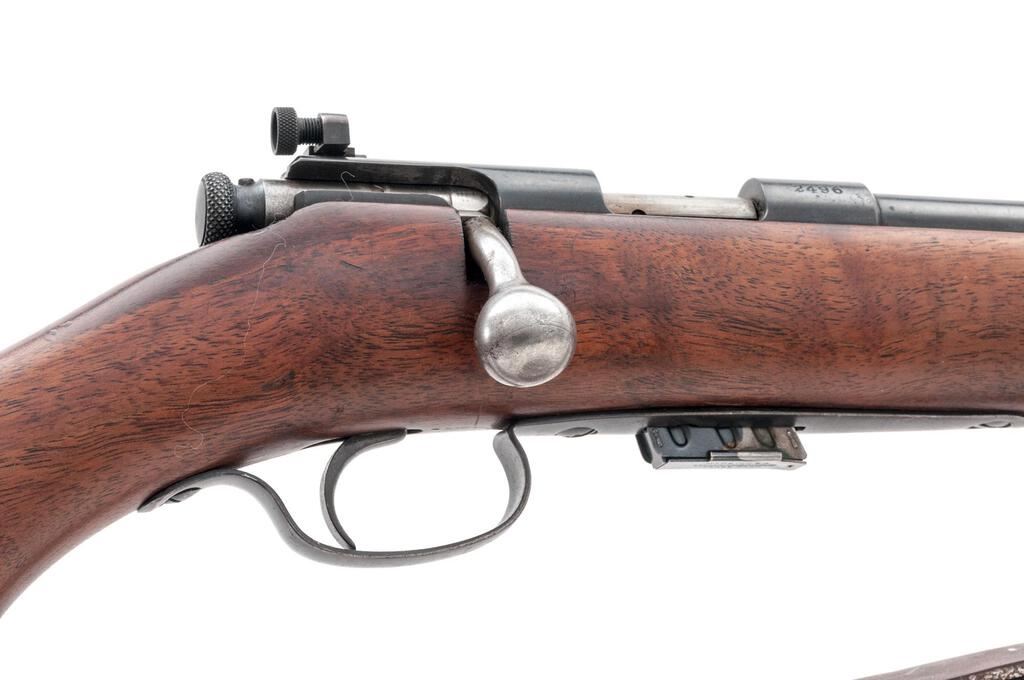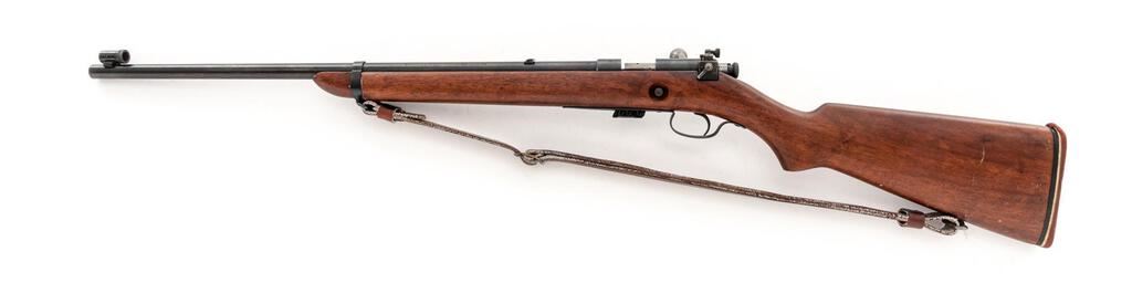 Winchester Model 57 Target Bolt Action Rifle, #2496, .22 LR cal., 22" barrel, Lyman globe style front and folding leaf rear sights, blue finish, smooth walnut one-piece pistol grip stock, magazine eject button on the stock, one Winchester marked 5-rd. magazine marked "MADE IN U.S.A./WINCHESTER/TRADEMARK" on the base, Lyman aperture sights at the rear of the receiver, sling swivels, and a period leather rifle sling. Mfg'd 1927. Rifle is in fine overall condition retaining approx. 90%-92% toning blue finish, with some wear at the muzzle, small scratches, and areas of light surface erosion, primarily along the barrel. There are crisp Winchester "WP" proofs on the barrel and front ring. Bolt is in the white, while the knurled cocking knob is blued. Smooth wood stock is in very good condition with small scrapes and mars from carry and use. Buttstock ends with a deteriorated solid rubber pad providing a 13-3/8" LOP, with 13" to the wood. Action is crisp and functions smoothly; bore is good showing use with defined rifling. Est.: $400-$600. (C&R)