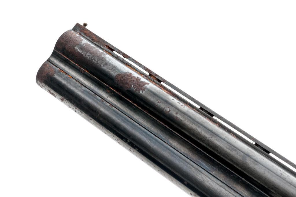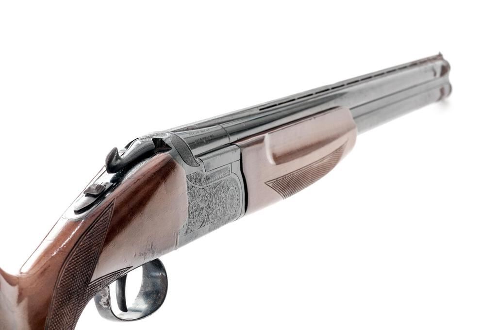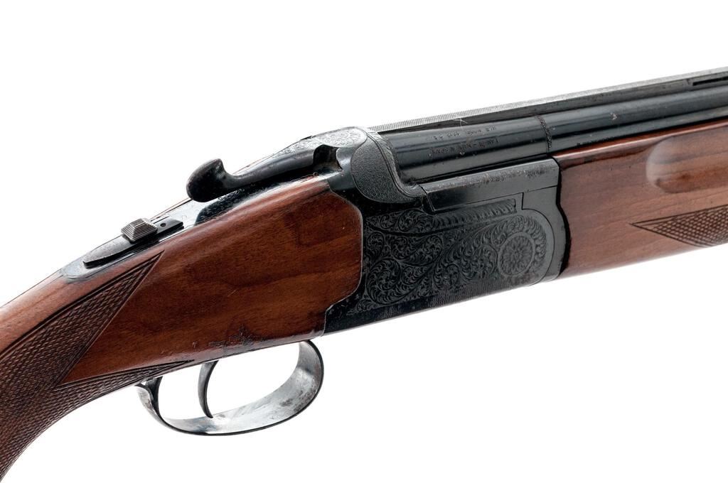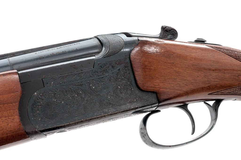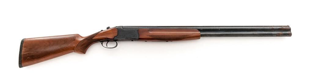 Harrington & Richardson Model 1212 Over/Under Shotgun, #IG1774731270. 12 ga. 27.5" vent rib barrels have 2-3/4" chambers and are choked Mod./Full. The boxlock action features a single selective trigger, automatic safety, and simple extractors. The finger-groove forend and pistol grip buttstock are European walnut and feature good checkering and a slender buttpad. Made by Lanber in Spain for H&R in the late 1970's. Condition is good, with significant rust to the barrels at their muzzles. Additional lesser damage to the receiver, and numerous small handling marks to the wood. Action closes tight and function well; bores are good. Est.: $250-$400. (Modern)