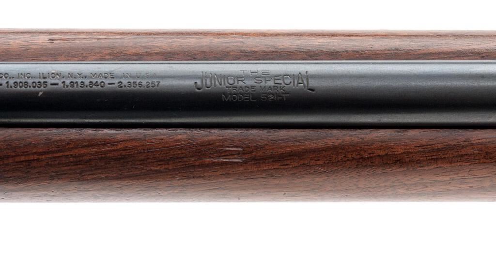 Remington Model 521-T Junior Special Bolt Action Rifle, NSNV, .22 S/L/LR cal., 25" round barrel, Redfield globe style front sight and no accommodation for a rear sight, Lyman aperture sight at the rear of the receiver, blue finish, smooth wood one-piece target stock with an accessory rail and sling swivels, and 6-rd. detachable Remington marked magazine. Mfg'd 1948. Rifle is in near fine overall condition retaining approx. 90%-92% toning blue finish, with light scratches and some discoloration at the front ring. There is scattered fine surface rust on the magazine well and trigger guard. Rear of the bolt, bolt handle and trigger show muted case colors. Smooth wood target stock is in good condition with a couple of 1.25" lateral cracks and a crude repair at the front of the forend. Buttstock ends with a black spacer and a replacement White Line solid rubber recoil pad providing a 12.25" LOP. Action works well, bore is bright with crisp rifling. Est.: $300-$400. (C&R)