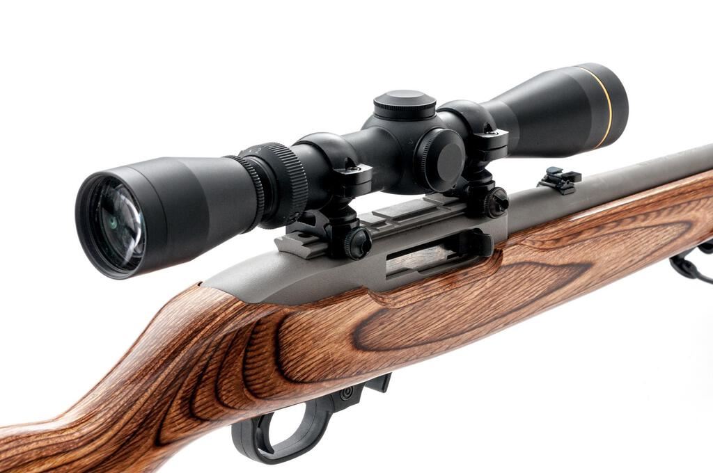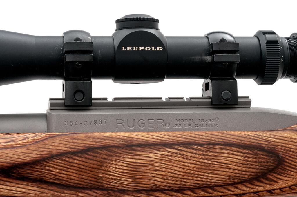 Ruger 10/22 Semi-Automatic Carbine, #354-37937, .22 LR cal., 18.5" barrel, banded brass bead blade front and folding rear sights, matte stainless steel, smooth laminate wood one-piece stock with sling studs, VLife bi-pod, and ending with a solid rubber Ruger marked recoil pad. The factory grooved receiver is topped with a set of rings and a Leupold VX-II 3-7x33 variable-power rifle scope in matte black, with a duplex reticle providing clear and crisp optics. Scope is covered with a Leupold marked bikini cover. Carbine mfg'd 2009. In near excellent condition showing little use, with a free-floated barrel showing only light handling marks. Stock is very good, again showing little use. Action is crisp, bore is very good. Lot includes three (3) Ruger factory 10-rd. rotary magazines, two (2) Butler Creek 10-rd. magazines, and a nylon rifle sling. Est.: $400-$600. (Modern)