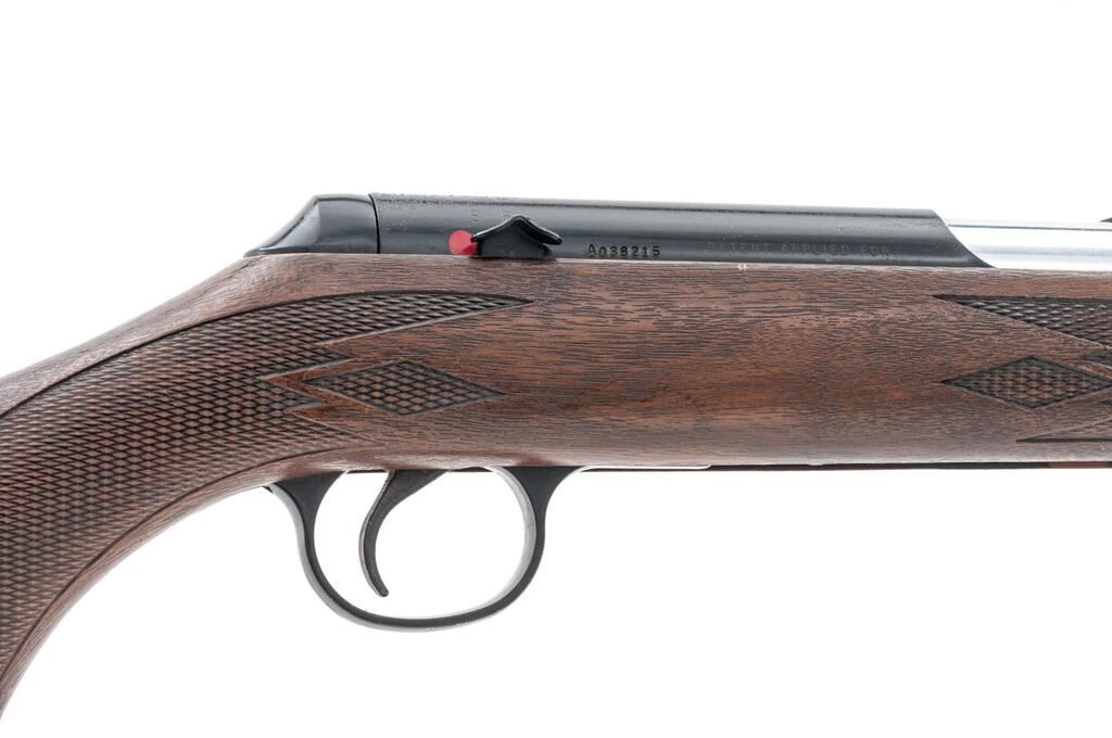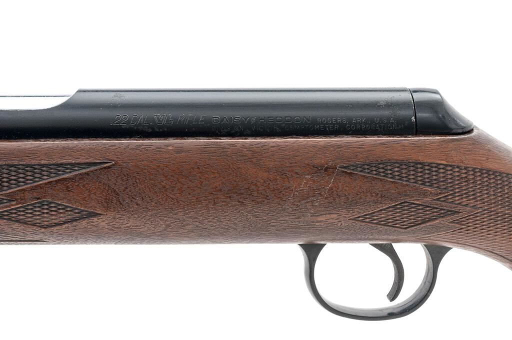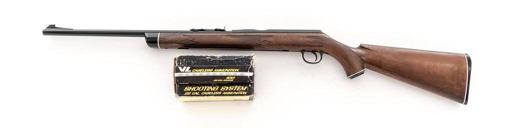 Daisy VL Caseless Standard Rifle, #A038215, .22 cal., 18" barrel, ramped blade front and standard elevator rear sights, black finish, checkered plastic wood grain finish one-piece stock. Includes approx. 1,200 rounds of Daisy .22 caseless ammunition in 100 round boxes. These rifles were of limited production from 1968-1969 with a total production of approx. 18,000. Rifle is in fine overall condition retaining approx. 92% factory finish, with light wear at the muzzle and a couple of small scratches, primarily on the barrel. There is light surface rust at the rear of the receiver and a couple of small mars on the trigger guard. Checkered plastic stock is in good condition. Action functions well, bore is bright with defined rifling. Est.: $300-$400. (C&R)