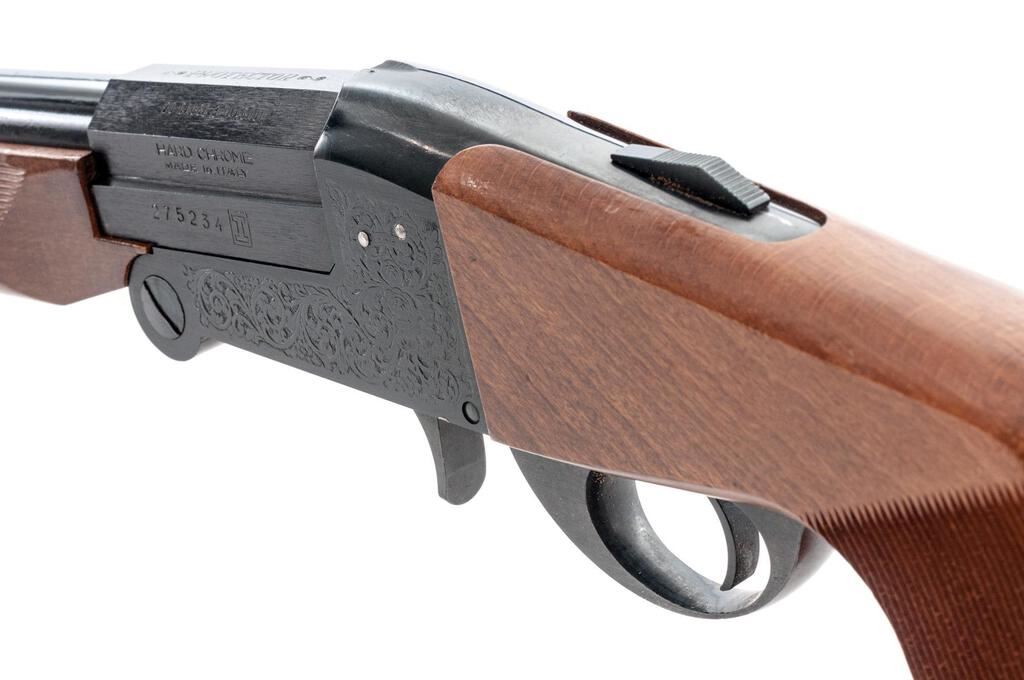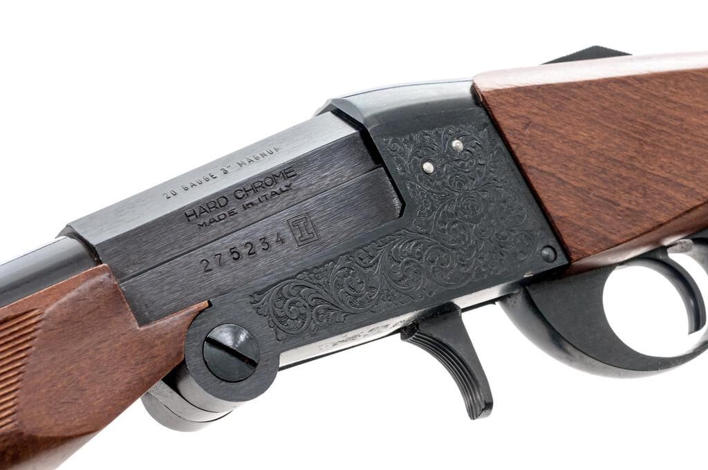 "Protector" Model Single Barrel Hammerless Personal Defense Shotgun, #275234. 20 ga. 20" plain barrel has a 3" chamber and a Cyl. bore. Action has a second trigger forward of the trigger guard to release the breech lock, much like the original Beretta Companion shotgun. Barrel is hard chromed, receiver lightly engraved, safety non-automatic. Forend and pistol grip are grooved for ease of gripping. Mfg'd 1985 in Italy. Condition is like new, with no significant wear to wood, metal or action, which closes tight; bore is bright. Est.: $250-$500. (Modern)