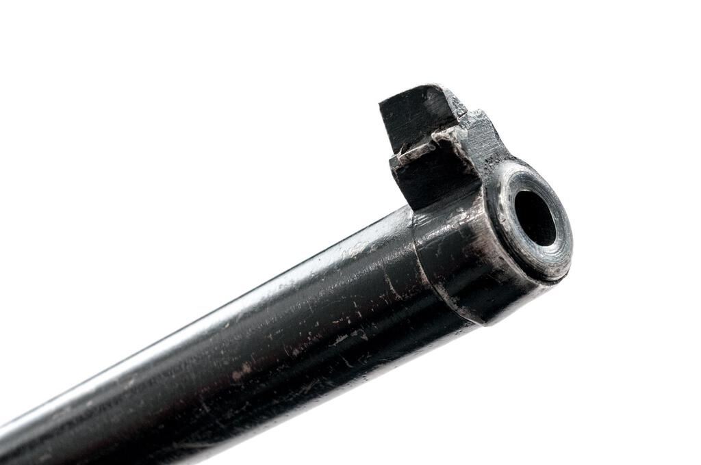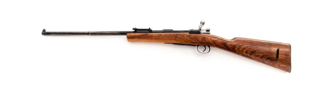 Modified Spanish Model 1893 Mauser Bolt Action Rifle, #E5494, 7x57mm, 22.4" barrel, black-painted finish, hardwood stock, inverted "V" front sight and adjustable folding leaf rear sight. Marked on top of receiver ring "(Crown)FABRICA DE ARMAS/OVIEDO/1898". Mismatched numbers on bolt handle. Rifle has been modified by cutting back and re-shaping barrel and forend, bending bolt handle, and removing buttstock sling mount. Condition is good as modified, with the metal retaining approx. 60% finish. Wood has had added varnish applied, now in good condition, with a drilled hole in the butt; gouges and overall handling marks to the finish. Action operates smoothly; bore has darkening in the grooves, otherwise good with good rifling. No visible import marks. Est.: $200-$300. (Modern)