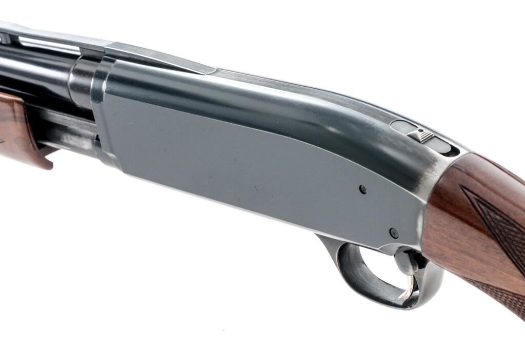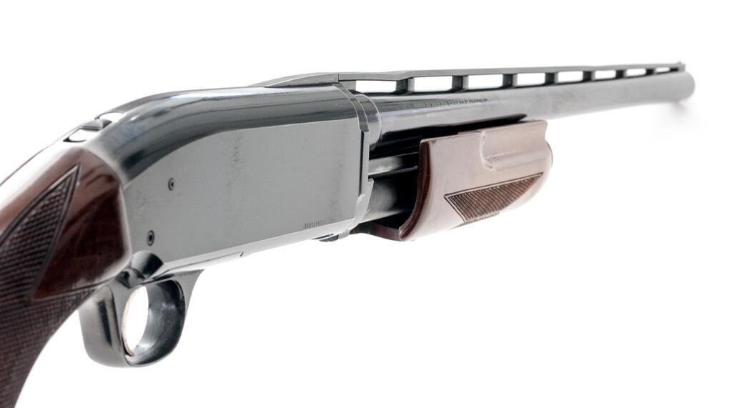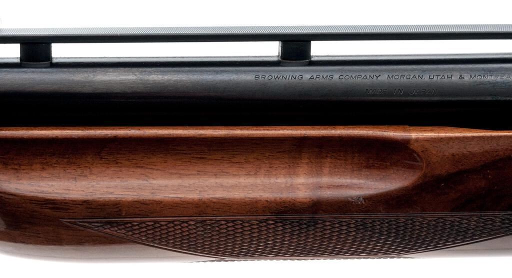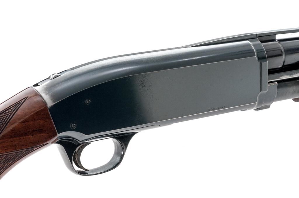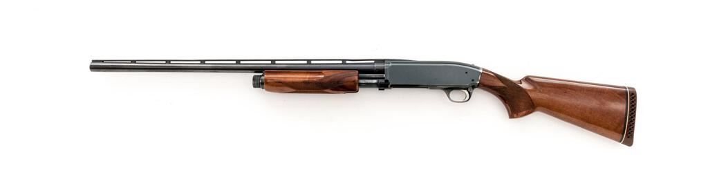 Browning BPS Field Model Slide-Action Shotgun, #33318PX152. 12 ga. 26" vent rib barrel has a 3" chamber and is fitted for standard Invector choke tubes (Full installed). The slide action is an update of the John Browning 1917 patents and is similar to the Ithaca M37, featuring downward ejection. The finger-groove forend and pistol grip buttstock are "B" Gade walnut, high gloss finished, with very sufficient checkering, no grip cap, and a Browning Pachmayr Whiteline recoil pad. Mfg'd 1983 by Miroku in Japan for Browning. Condition is very good retaining approx. 90%-95% finish, with little wear to the positive action, which locks up tight and functions correctly. There are a few small handling marks to the wood, some blue wear to the top of the receiver near the safety, and a small depression in the vent rib near the breech. However, the gun is sound, bore is bright, and should function well for years. Est.: $300-$400. (Modern)