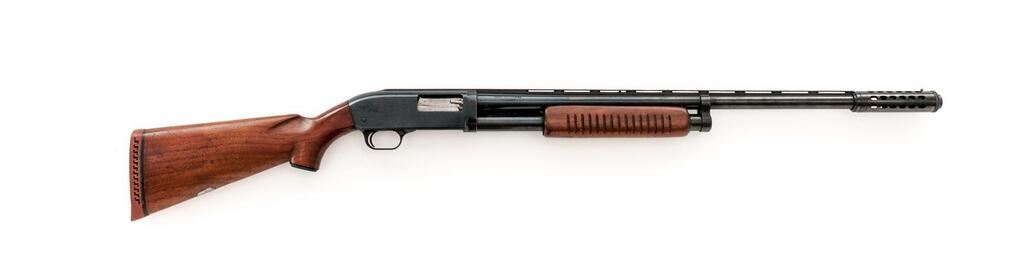 J.C. Higgins Model 20 Field Grade Slide-Action Shotgun, NVSN. 12 ga. 26.5" vent rib barrel has target beads, 2-3/4" chamber, and is fitted with a "Power Pac" recoil reduction device, with a "short range" tube installed. The action is identical to the High Standard Model 200, with magazine cutoff. The simple forend and pistol grip buttstock are Field Grade walnut, uncheckered, with a plastic grip cap and red butt pad. Mfg'd approx. 1970's. Condition is good to very good showing moderate field use. Wood has numerous very small marks. Action cycles smoothly and locks tight; bore is very good. Est.: $150-$300. (Modern)
