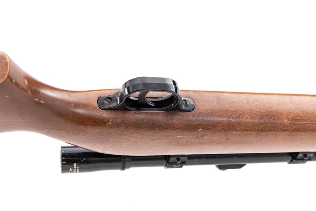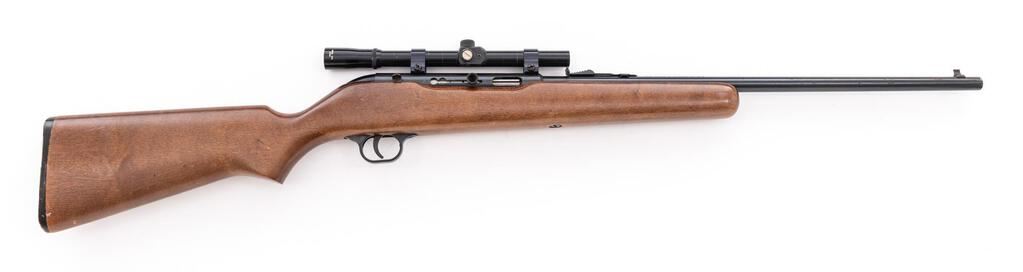 Mossberg Model 380 Semi-Automatic Rifle, #M39235, .22 LR cal., 20" barrel, blade front and standard elevator rear sights, blue finish, smooth wood one-piece pistol grip stock, ribbed plastic buttplate, tubular magazine that loads thru the buttstock, and plastic trigger guard. Factory grooved receiver is topped with rings and a Savage Springfield Model 1541 4x15 fixed-power scope in gloss black with fine wire reticle. Exterior of scope is worn with scratches and mars; glass is clear and bright. Rifle is in good overall condition retaining a significant amount of blue finish, with scattered light to moderate surface rust the length of the barrel due to poor storage. Smooth wood stock is good with dents, mars, and some paint transfer. Action functions well, bore is good. Would benefit from some TLC. Est.: $150-$250. (C&R)