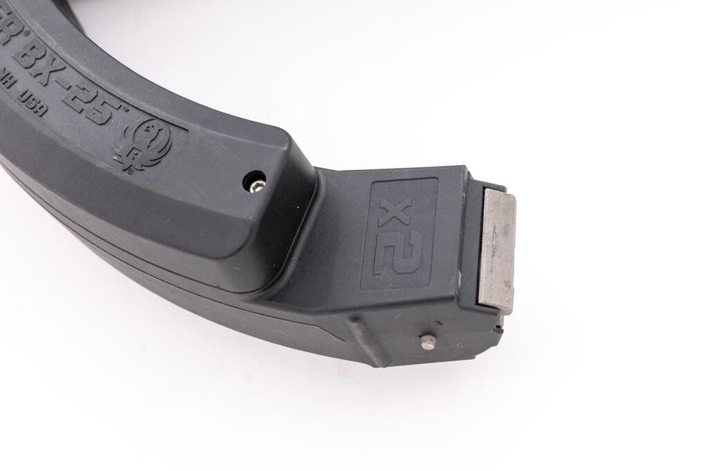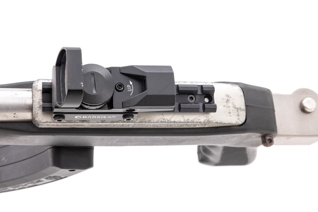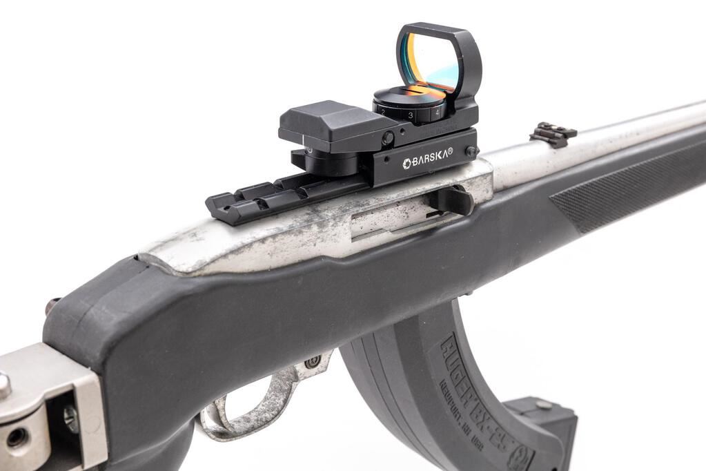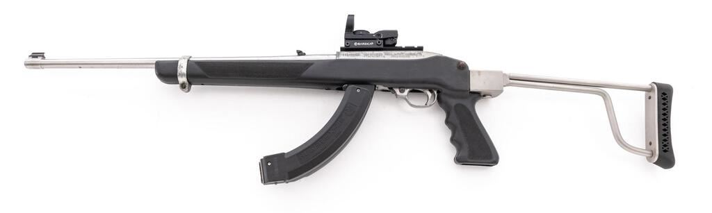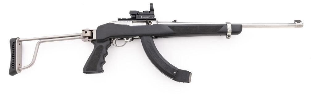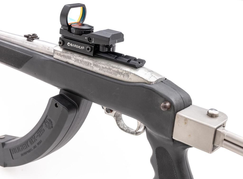Ruger Model 10/22 Semi-Automatic Carbine, #239-73898, .22 LR cal., 18.5" barrel, ramped brass bead blade front and folding rear sights, matte stainless steel finish, aftermarket Butler Creek synthetic pistol grip and skeletonized buttstock with a ventilated rubber pad, no magazine. Mfg'd 1994. Topped with a one-piece mount and a Barska Electro Sight red dot sight. Carbine is in very good overall condition retaining a significant amount of matte stainless finish, with scratches, mars, and thinning of finish. Barrel shows a freckling of light surface rust, while the receiver has scrapes and scuffs on both sides. Stock is good with scratches, mars, and wear. Action functions well, bore is good. Includes a pair of Ruger BX-25 hi-capacity magazines. Est.: $200-$400. (Modern)(Hi-cap mags not available to Calif. residents.)