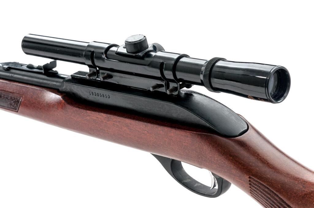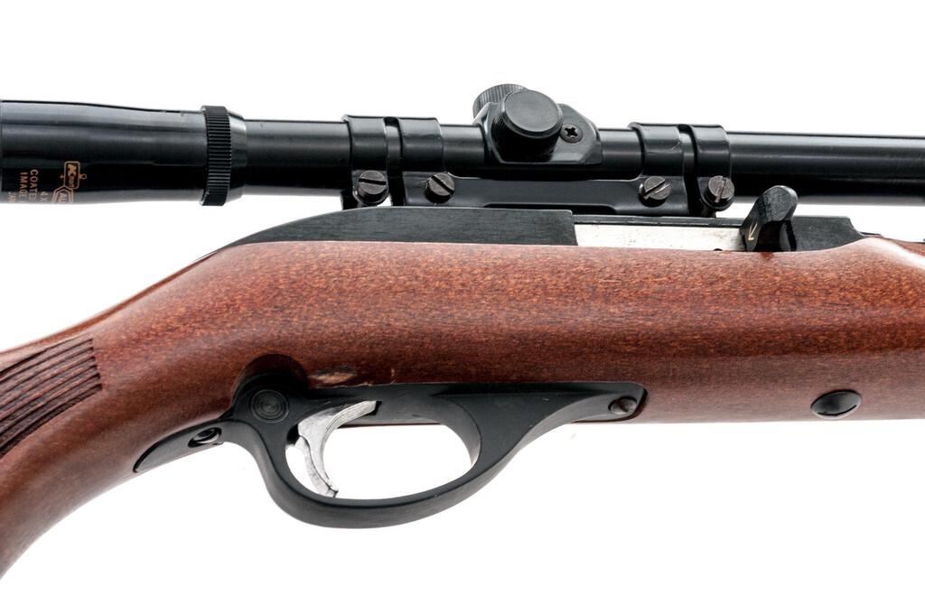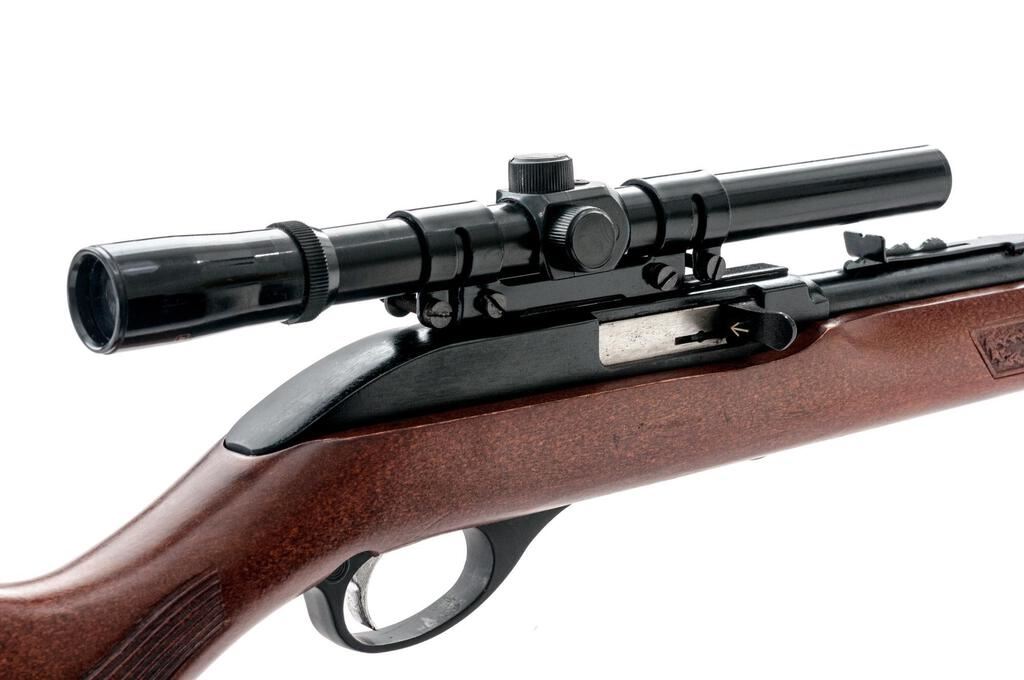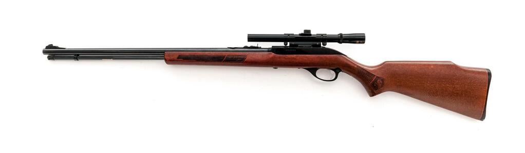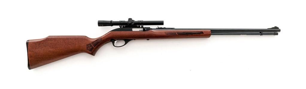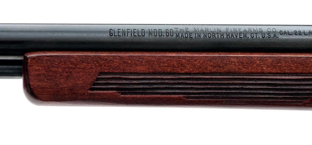 Marlin Glenfield Model 60 Semi-Automatic Rifle, .22 LR cal., #19305853, .22 LR cal., 22" micro-groove barrel with full-length magazine tube, ramped blade front and standard elevator rear sights, blue finish, impress checkered one-piece pistol grip Monte Carlo stock with checkered plastic buttplate, factory grooved receiver is topped with a one-piece mount and an All-Pro 4x15 fixed-power rifle scope in gloss black, with a fine wire reticle and bright clear optics. Rifle is in near excellent overall condition retaining approx. 94%-96% factory finish showing handling and storage marks. The Monte Carlo stock is very good with the classic chipmunk at the pistol grip. Action is crisp, bore is very good, and the markings are sharp on this nice Model 60. Est.: $150-$250. (Modern)