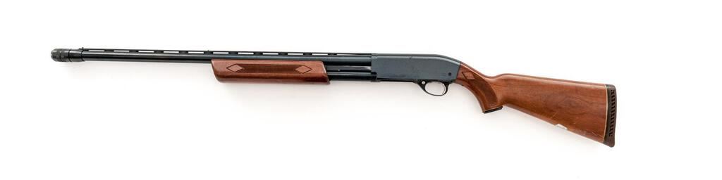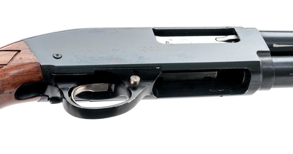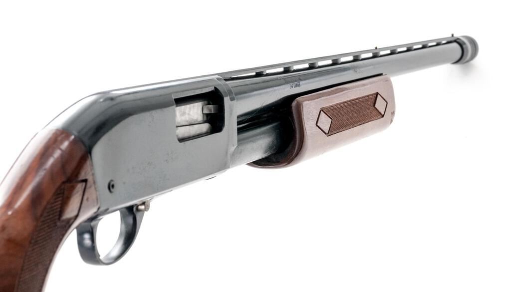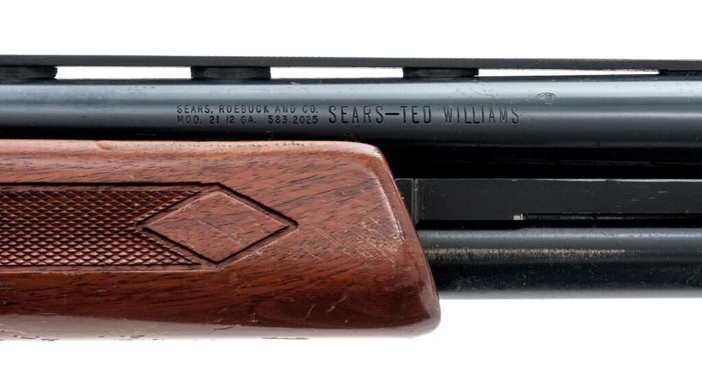 Sears Ted Williams Model 21 Slide-Action Shotgun, NVSN. 12 ga. 27" vent rib barrel has a 2-3/4" chamber and is fitted with a Collett-type variable choke device. Action is similar to the High Standard Flight King Deluxe, the company that made the gun for Sears. The wide forend and pistol grip buttstock are American walnut with distinctive checkering, grip cap and butt pad. Mfg'd approx. 1950s. Condition is good to very good, with numerous marks to wood and freckling to receiver. Action closes tight and functions well, bore is very good. Est.: $150-$250. (C&R)