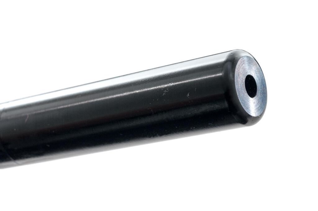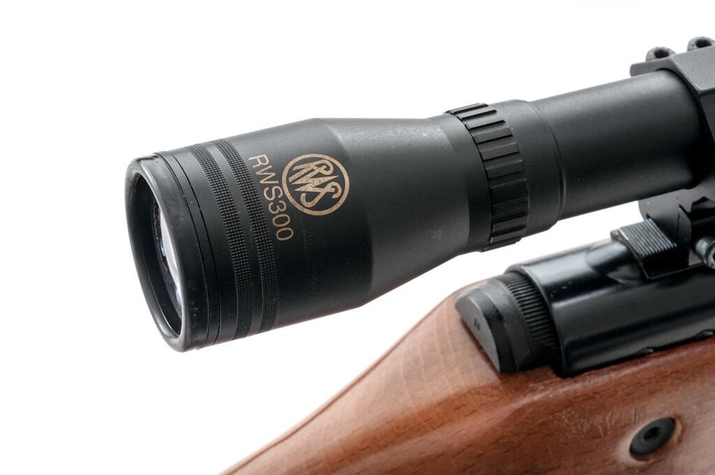 RWS Diana Model 45 Single Shot Air Rifle, #321926, .177 cal., 24" barrel, front and rear sights and a stabilizer added, blue finish, smooth wood one-piece pistol grip stock with ventilated rubber recoil pad. Topped with a one-piece base, rings, and an RWS 300 fixed 4x rifle scope in matte finish with an adjustable objective and duplex reticle with clear optics. Lot includes the front and rear sights. Rifle is in very good overall condition with light scratches and handling marks. Left side of the action is marked "MADE IN GERMANY". Smooth wood stock is very good. Action locks up tight, bore is good. Est.: $150-$250.