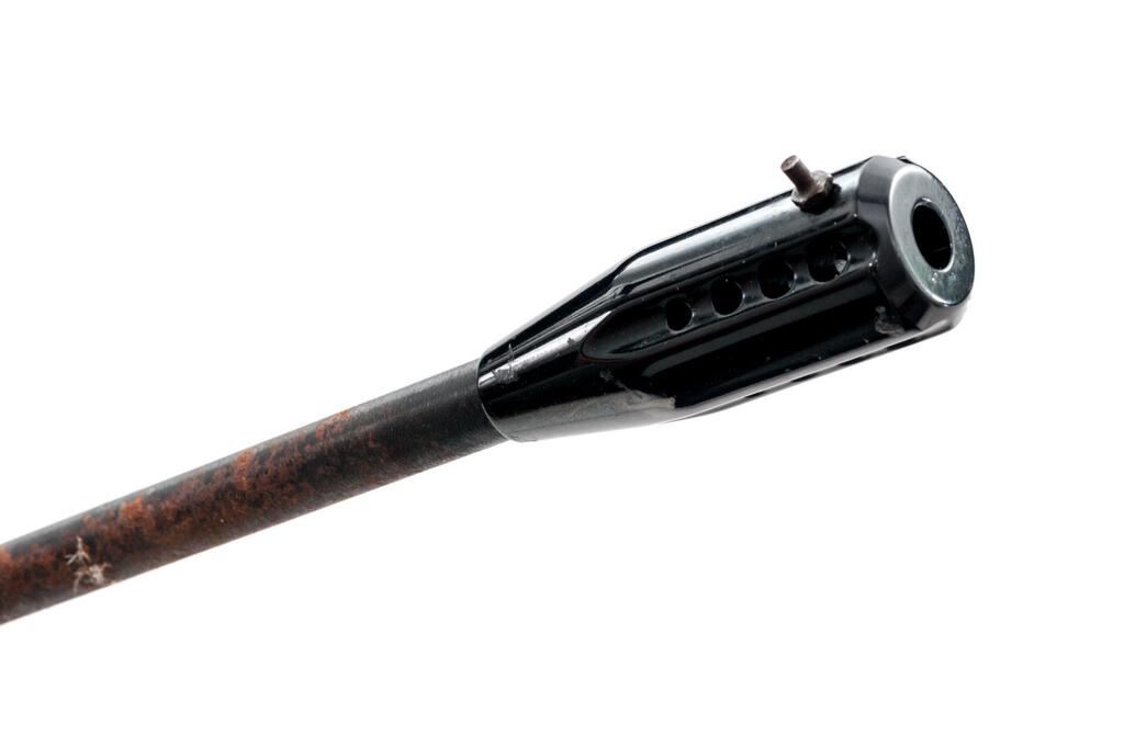 Crossman Model 2300 CO2 Powered Air Pistol, #SPW642696, .22 cal., 16" barrel including muzzle device, blued finish, smooth wood grips, topped with an AIM 3-9x40 scope. Pistol is in overall good condition. Metal surfaces have scattered rust and pitting on the air tube and cocking piece, and a majority on the barrel. Wood grips exhibit minor scuffs and handling marks. Pistol has not been tested for function, and there is an empty CO2 container in the tube, which we are not able to remove. The AIM scope is in very good condition, medium crosshair reticle is clear; front objective is covered by an unmarked scope cap with a broken hinge. Est.: $80-$120.