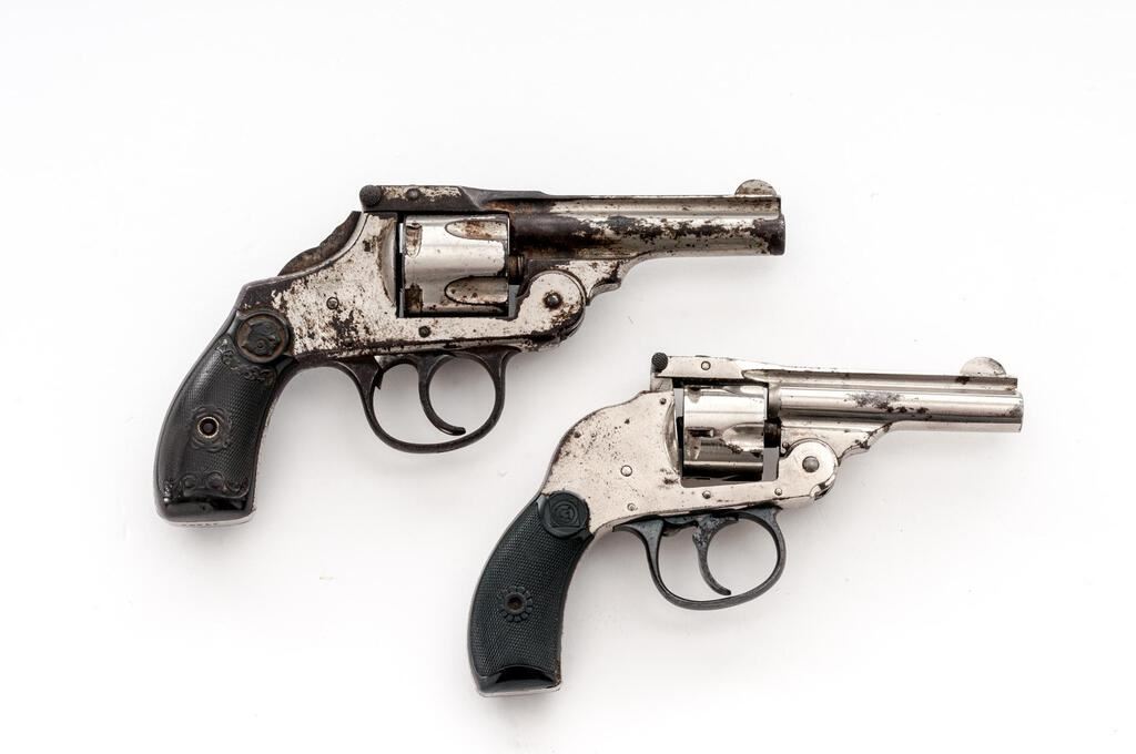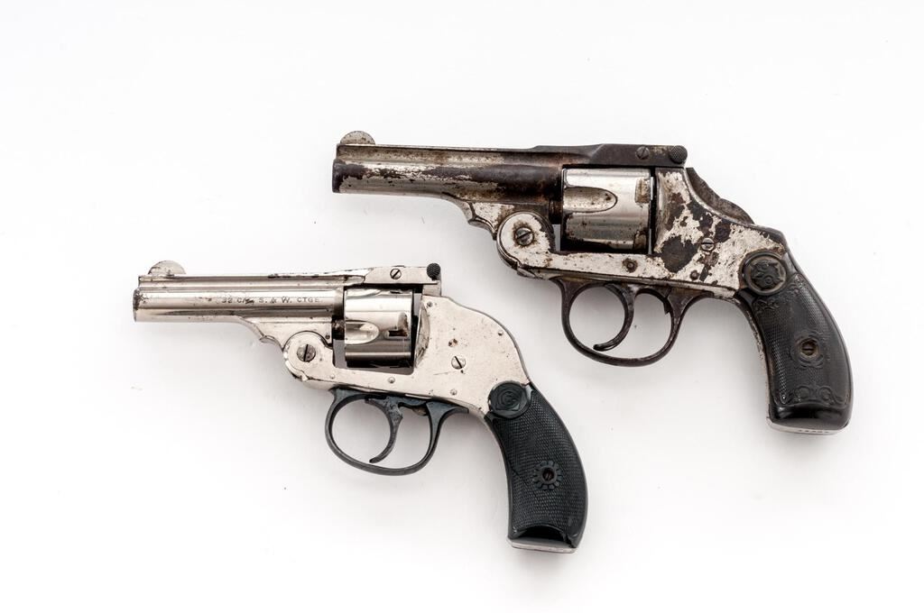 Lot of Two (2) Pocket Cartridge Revolvers: (1) Harrington & Richardson Double-Action "Hammerless", .32 cal., styled after the S&W 3rd Model 32, #204329, .32 CF cal., 3" round barrel marked with maker's name and address on full-length top rib, "32 Cal. S.&W. Ctge." at left; auto-eject 5-shot fluted cylinder; "humpback" frame has large front hinge, integral straps, 2-pc. finely-checkered hard rubber grips with "bullseye" logo at top. Condition is very good retaining approx. 93% bright nickel, sharply-detailed grips with .25" chip at right-bottom. Action defective, frosted bore shows good rifling. (2) Iver Johnson DA, only .38 styled after the S&W 4th Model 38, #29302, .38 CF cal., 3.25" barrel marked with the 2-line maker's name, address, patents on full-length top rib; auto-eject 5-shot cylinder; saw-handle frame has large front hinge, integral straps, 2-pc. fancy checkered hard rubber grips with "Owl" logo at top. Condition is good retaining approx. 20% dulling nickel with scattered bubbling, discoloration, and light erosion. Grips show light wear and fine detail. Action is crisp, bore shows light erosion, good rifling. Est.: $150-$250/Lot. (C&R/PPT)