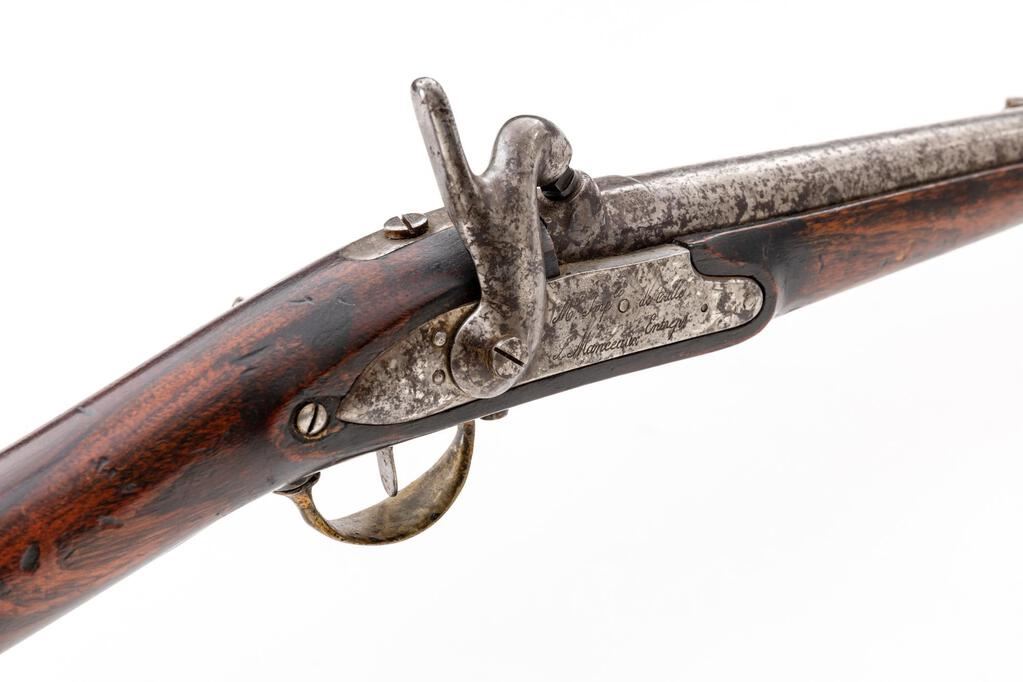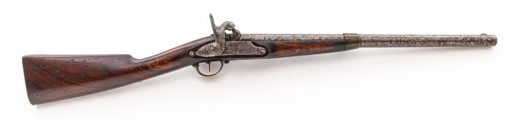 Antique French Percussion Carbine, Mfg'd at Tulle Armory, NVSN, .72 cal., 19.75" round barrel has low-blade front, notched rear sights; bevel-edge carbine lock with rounded/pointed tail marked "Mre. Imple. De Tulle/J. Manceaux Entrepl", has tall left-leaning hammer, was altered from original flintlock; 11.75" front-hinged sling bar with double rings at left side; brass fittings include trigger guard on iron floorplate, flat buttplate, serpentine sideplate, nosecap with bar attachment. Oil-finished hardwood halfstock with "fish-belly" butt profile. Condition is good showing gray gunmetal cleaned of moderate etching with fine edges and clear markings, age-toned brass. Stock is sound showing scattered mostly small marks, smooth added finish. Two-click action is crisp (replaced nipple), smoothbore is bright. Est.: $600-$900. (Antique)