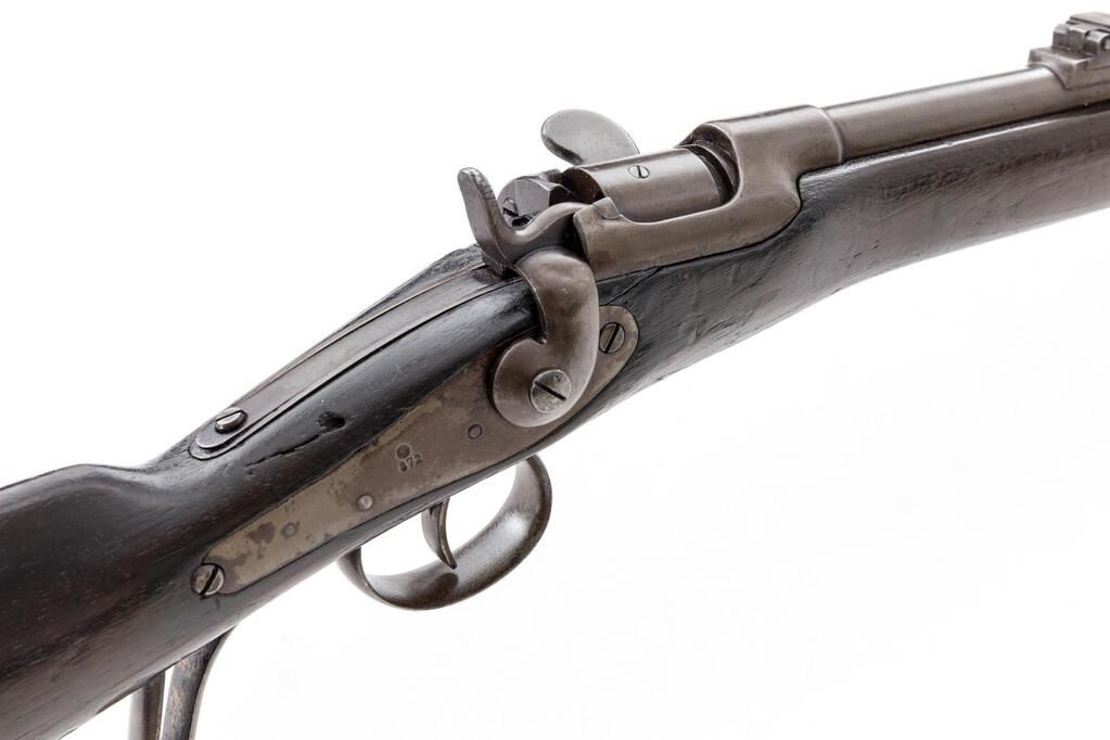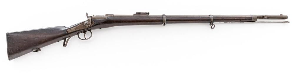 Austrian Model 1867 Werndl Breechloading Single-Shot Military Musket, #872, 11mm CF cal., 33.25" round barrel has block-blade front sight and large graduated folding-leaf rear, bayonet lug 4" below right muzzle, marked "1", "St 83" and "Wn 73"; receiver marked at top with conjoined "OE" and "WG", has unique rotating breechblock with rebounding firing pin, 4" spring on tang to hold in place; long back-action lock has tiny sunken round "(lion's face)" mark over "872", hammer marked "B" and "3" at left side; steel fittings include trigger guard with long finger-rest, buttplate marked "V.L St. WB./5212", 2 clamping bands (top with sling swivel), nosecap, slotted ramrod. Oil-stained walnut 3/4 stock stamped "W" atop comb, has smaller marks and sling swivel at belly. Condition is very good showing smooth gray-brown gunmetal (bit of roughness forming at top of buttplate) having sharp edges and markings. Dark finished stock shows scattered dings and nicks from military use yet is sound. Action is strong and crisp, bore shows overall light etching and deep/sharp rifling. Est.: $1,200-$1,800. (Antique)