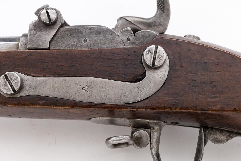 Antique Swiss Model 1842/67 Infantry Rifle, with Milbank-Amsler Metallic Cartridge Breechloading Alteration, #706, 18mm RF cal., 40.5" round barrel with blade front sight and unusual stirrup-type elevation-adjustable rear, marked "706" with what appears to be the "rampant bear" mark of Canton Appenzell at rear sight and a sunken oval "(cross)/V" acceptance mark at breech; large square-front lockplate (originally flintlock) is marked "(crown)/BF" (Beuret Freres of Liege, the original maker), has large military-style hammer; front-hinged "trapdoor" style breechblock has right-side release knob, is marked "Geb. Sulzer" and 3 "(cross)/V" marks outside, "S 706" inside; steel fittings include 2-pc. trigger guard with sling swivel and 2 finger-grooves, wide buttplate, serpentine sideplate, 3 spring-retained bands (top of the double-strap type, middle with sling swivel), trumpet-tip ramrod marked "2/265" (all having the "(crown)/BF" maker's mark). Fullstock of oil-finished walnut is marked "706" at sideplate, "1150" and large "E.G." within oval at left, "(star)/(crown)/Beuret/1/0" on belly. Condition is fine having overall bright finish with sharp edges and markings. Stock is sound and smooth with small wood losses at middle band, occasional minor marks, added varnish. Action is strong and crisp, clean bore shows light frosting and fine rifling. This breechloading mechanism was designed and patented by American Isaac Milbank, modified by Rudolf Amsler, and adopted by the Swiss Army in 1863. Est.: $1,000-$1,500. (Antique)