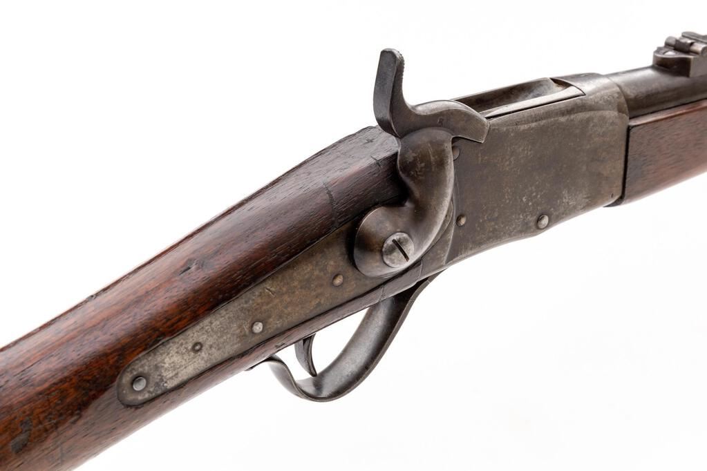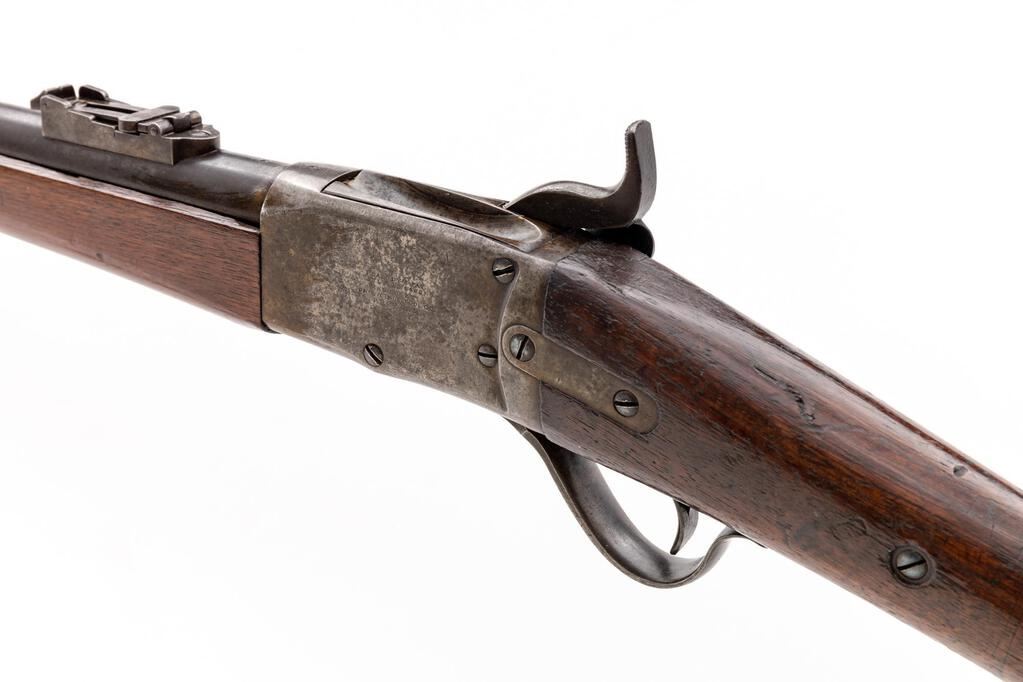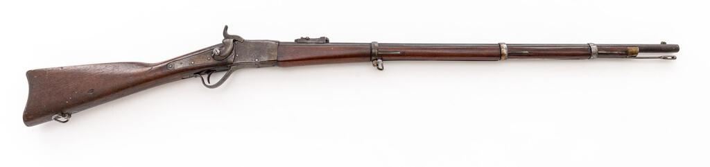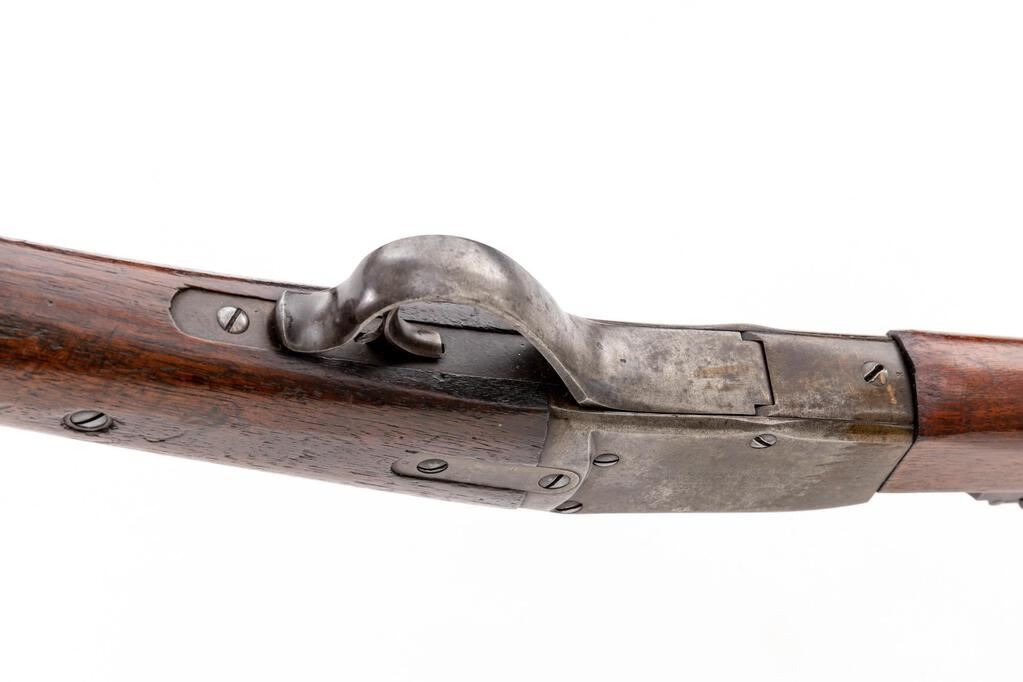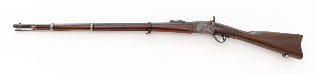 Antique Peabody Breechloading Metallic Cartridge Military Rifle, NVSN, .45 Peabody RF cal., 33" round barrel with standard military sights (front doubles as bayonet lug) has "(crown)/V" proof mark at breech; receiver has same mark and "S" at breech, "Peabody's Pat/July 22, 1862/Man'f'd. by/Providence Tool Co./Prov., R.I." at left, serpentine trigger guard/operating lever; back-action lock with military hammer marked "E". Forestock of oil-finished walnut has 3 spring-retained bands (bottom with sling swivel), nosecap, slotted/grooved ramrod, matching buttstock a curved buttplate and swivel at belly, what appears to be a small inspector cartouche (indistinct) at left wrist. Mfg'd ca. 1866-71. Condition is very good retaining much darkened barrel blue, silvered case colors, else smooth gray gunmetal with sharp edges and markings. Stocks are sound and smooth showing generally light age and use marks (esp. buttstock), added varnish. Action is crisp, bore shows moderate etching, very good rifling. Est.: $900-$1,200. (Antique)