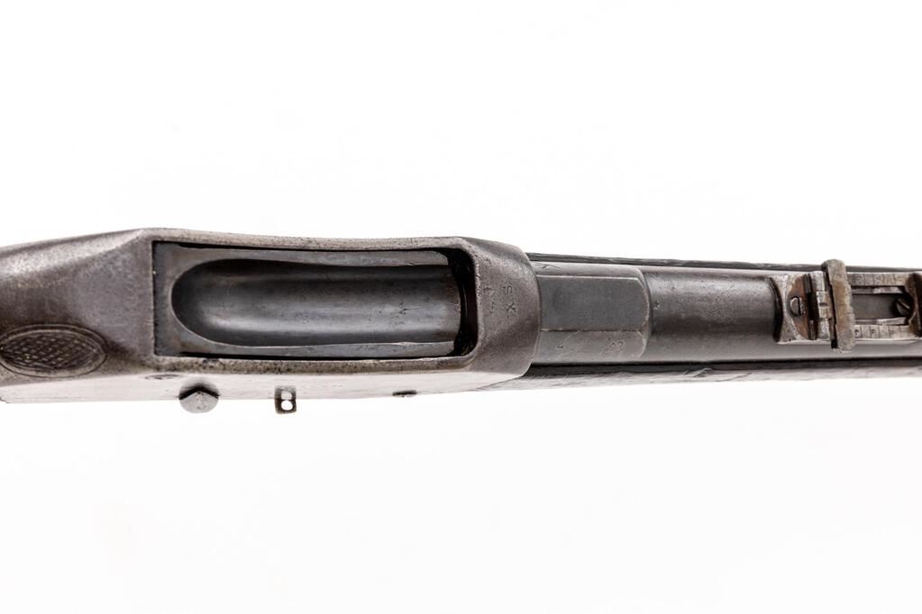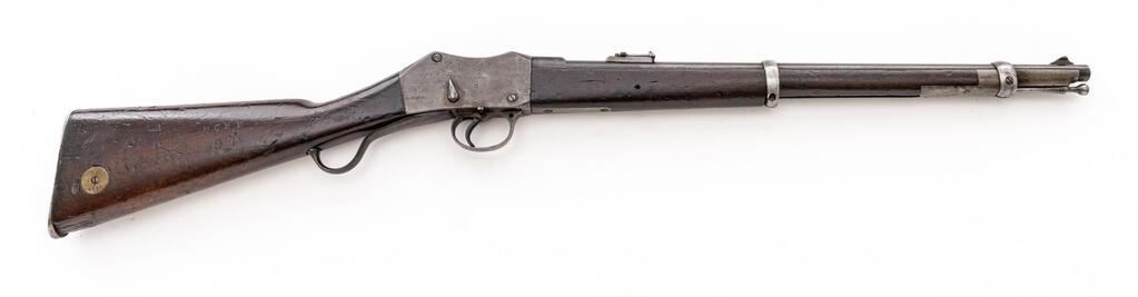Antique Martini-Henry Enfield Breechloading IC1 Cavalry Carbine, NVSN, .455 CF cal., 21.4" round barrel, winged blade front and sliding-leaf rear sights, marked with numerous British marks including "(crown)/V.R./1.P.", "(crown)/V.R./(crossed swords)/2.P.", "(crown)/E/6", "(star)" and "(facing broad arrows)" (sold out of service mark) in area of raised breech; flat-side receiver is marked "(large crown)/V.R./Enfield/1887/(crown/broad arrow)/I.C.1.", "2" and "(crown)/BF" at right, has dropping breechblock operated by 5.5" underlever marked "(broad arrow)/WD/(crown)/E/29"; steel fittings include trigger guard marked "(crown)/E/69", straight buttplate marked "(broad arrow)/WD/(crown)/E", 2 clamping bands, 6" nosecap retaining the button-tip ramrod. Oil-finished 2-pc. English walnut fullstock has right-side 1" brass roundel marked "6.04/M/5Krr/12", .75" impressed roundel marked "Birmingham 1894" surrounding "(broad arrow)/WD", and "1/2", "(facing broad arrows)", "MCBB/97". Mfg'd ca. 1887. Condition is good retaining traces of blue and scattered oxidation and discoloration over gray gunmetal, fine edges and markings. Stocks are sound showing rather heavy age and military use marks, a thru-hole 4" ahead of receiver, generally good markings and perhaps added finish. Action is strong and crisp, bore is bright showing 2" light erosion at muzzle and sharp polygonal rifling. Est.: $700-$900. (Antique)