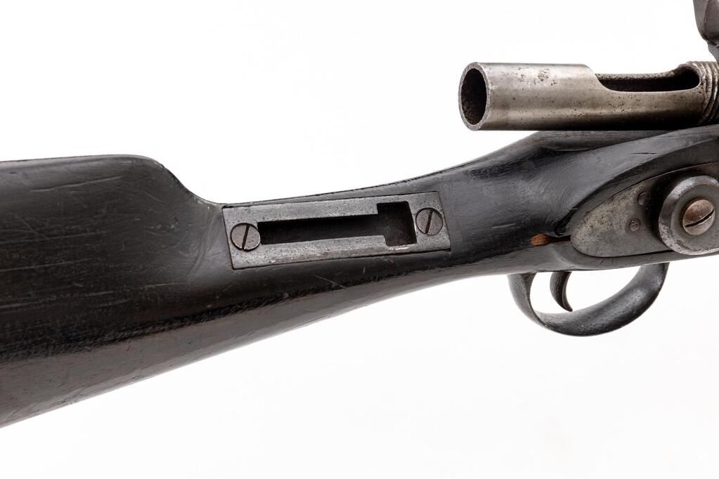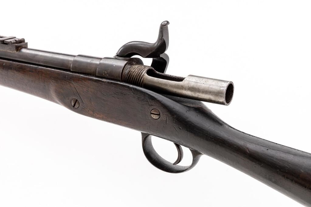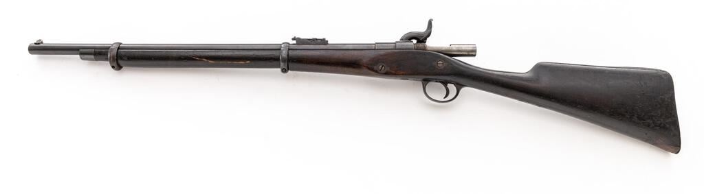Most Unusual Antique Probably European Breechloading Short Rifle, Unmarked as to Maker or Origin, NVSN, .577 cal., unmarked 24" round barrel has dovetailed blade front and folding-leaf rear sights; 1.25" breech section has percussion nipple-type fitting that may have been intended to house a firing pin, and a 4.25" "receiver" threaded into back end with a 1.25" opening for loading/extracting metallic cartridges (receiver was never completed, as it is open at rear). Unmarked flat lockplate with large military-style hammer. Steel fittings include trigger guard with long rear tang, buttplate, 2 clamping bands, nosecap. Lack of a ramrod indicates likely mfg'd as a cartridge arm. 3/4 stock of oil-finished walnut has small wrist area with inlet iron "keyhole" plate for an unknown attachment. Condition is good to very good as configured, the barrel retaining what appears to be much thinning and dulling original blue, balance of the metal reblued over occasional pitting. Stock is sound showing 1.75" replaced wood at toe, scattered minor dings, later varnish. Hammer and trigger function, brilliant bore shows sharp and deep rifling. Possibly an inventor's model due to its unfinished state or intended as an experimental/trials piece. Est.: $900-$1,200. (Antique)