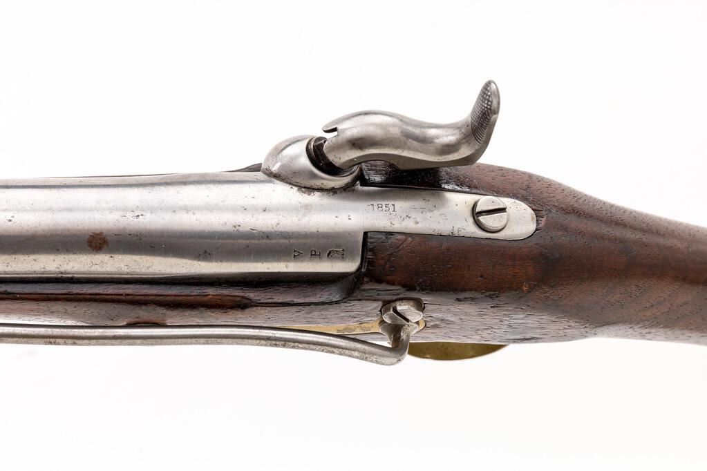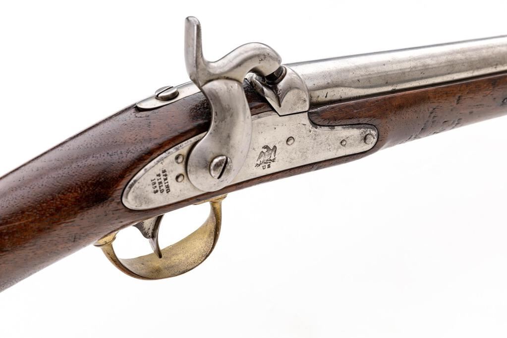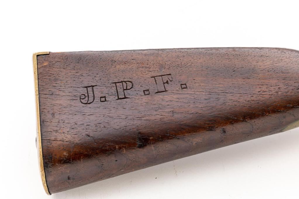 Mexican War-Era U.S. Springfield Model 1847 Percussion Cavalry Musketoon, NVSN, .69 cal., 26" round barrel without sights, marked "V/P/(eagle head)" and "1851" at breech; beveled lockplate has "(spread-wing eagle holding olive branches)" over "US" ahead of hammer, Spring/Field/1853" vertically behind; brass fittings are 2-pc. trigger guard, straight buttplate marked "U.S." at top, sideplate, 2 bands (front of the double-strap type with integral sight); steel 9.25" sling bar/ring at left, stirrup-retained button-tip ramrod. Oil-finished walnut fullstock. Mfg'd ca. 1848-59, in approx. 6000 qty. Condition is very good showing cleaned bright finishes, sharp edges and markings. Stock is sound with "J.P.F." carved at right, mild marks, added varnish. Action is strong and crisp, bore shows light to moderate etching and good rifling. Est.: $1,800-$2,400. (Antique)