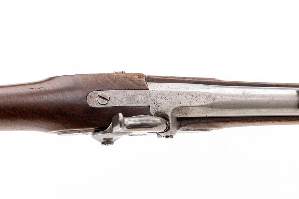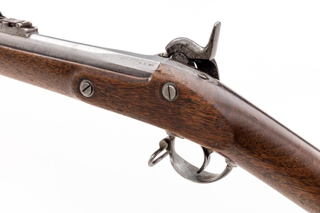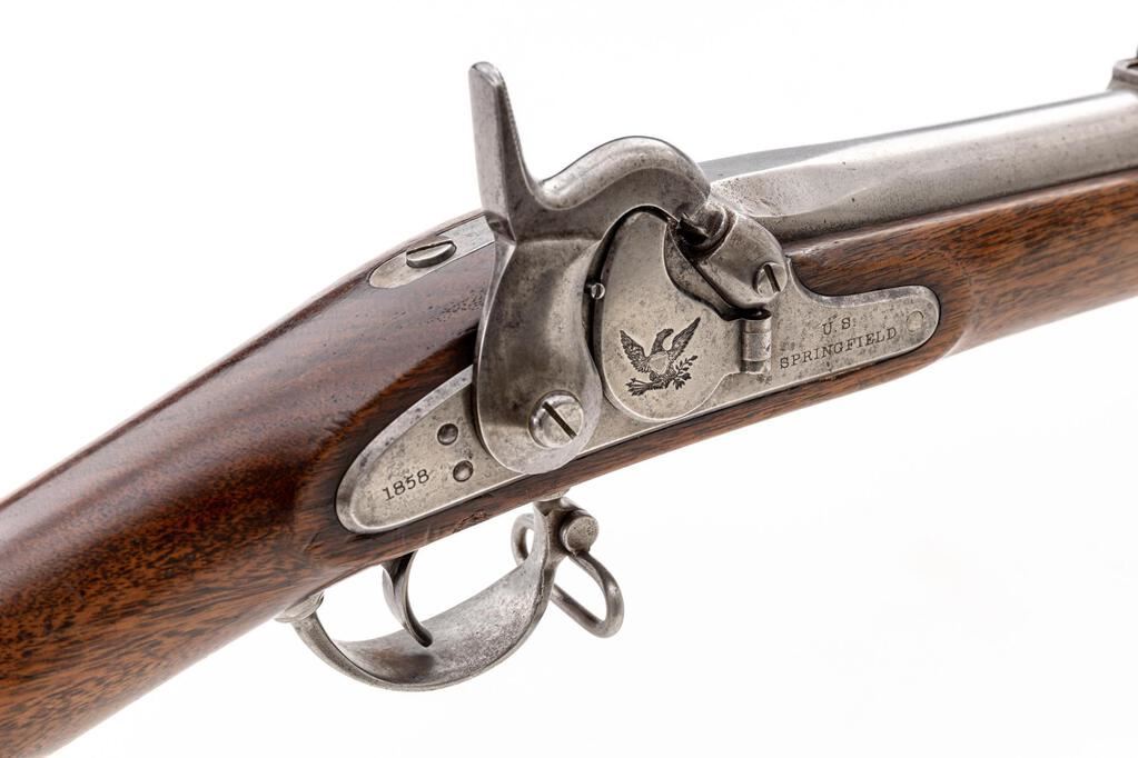 U.S. Springfield Model 1855 Single-Shot Percussion Rifle-Musket, NVSN, .58 cal., 40" round barrel marked "V/P/(eagle head)" and "1858" at semi-octagonal breech, with standard sights (front doubles as bayonet lug), cleanout screw-on nipple bolster; beveled lockplate has integral Maynard tape primer mechanism marked "(large eagle)" on right-hinged door, "U.S./Springfield" ahead of hammer, "1858" behind. Steel trigger guard with sling swivel, buttplate marked "US", 3 bands (middle with swivel), brass nosecap retains the tulip-tip ramrod. Oil-stained walnut fullstock. Mfg'd 1858. Condition is fine showing smooth, dulling bright gunmetal (bit of light erosion at nipple) with sharp edges and markings. Stock is sound and smooth showing nice grain, color and finish, lacks inspector's cartouche at left. Action is strong and crisp, bore shows frosting and fine rifling. Est.: $1,800-$2,400. (Antique)